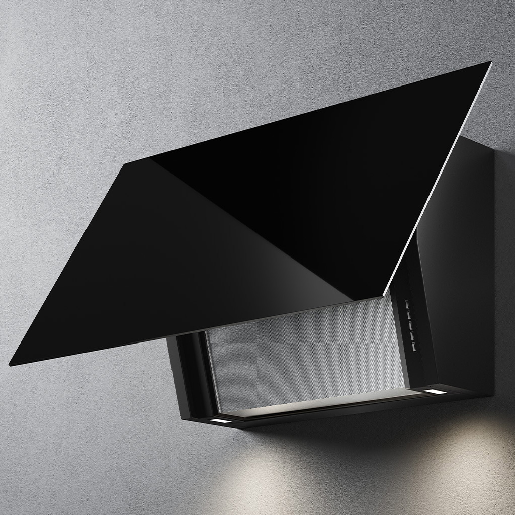Okap przyścienny w kolorze czarnym, sterowanie elektroniczne, filtr przeciwtłuszczowy metalowy, wymienny z możliwością mycia, front otwierany, dynamic LED Light (2700K – 5600K), bardzo cienki korpus. Wersja wyciąg, 600 m³/h, 85 cm.