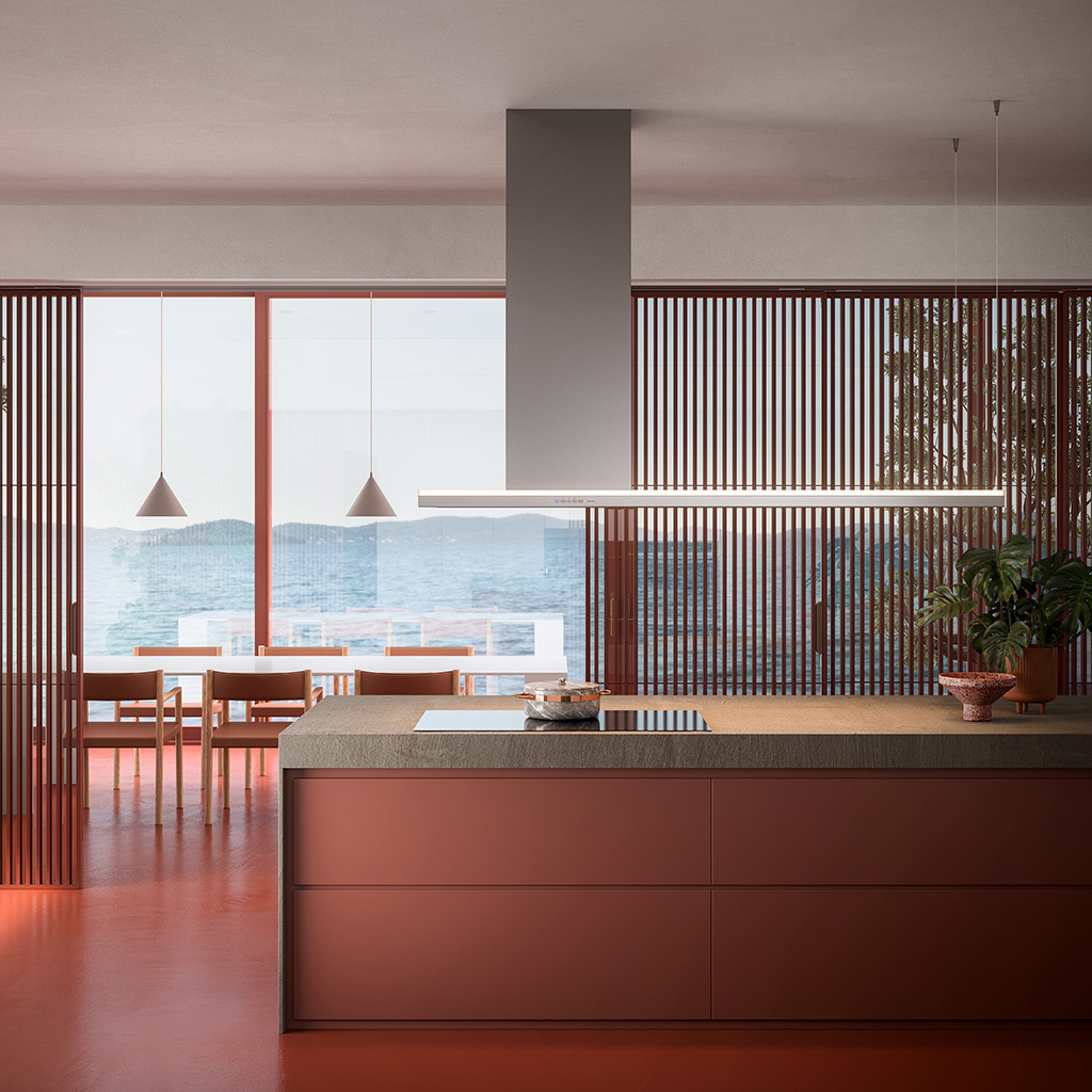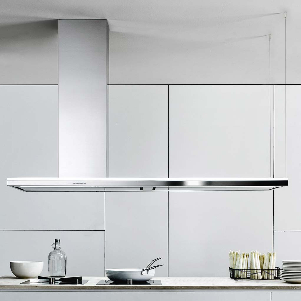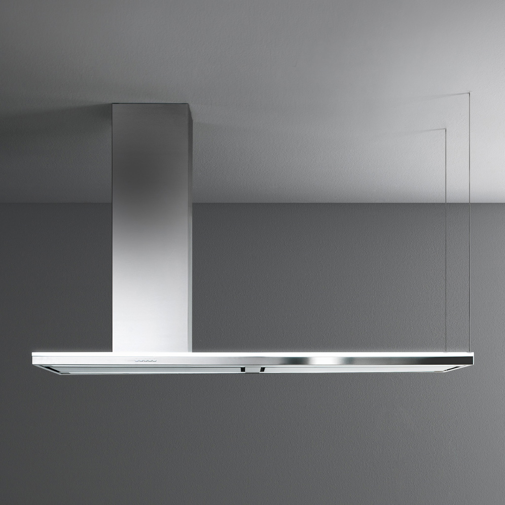 Okap wyspowy w kolorze stal inox, wykończenie Scotch Brite, wyciąg szczelinowy, sterowanie elektroniczne, oświetlenie LED, komin po lewej stronie. Wersja wyciąg, 800 m³/h, 175 cm.