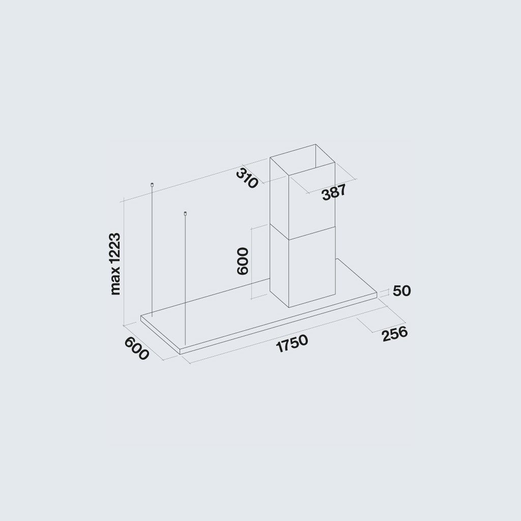 Okap wyspowy w kolorze stal inox, wykończenie Scotch Brite, technologia NRS zapewniająca ciszę w kuchni, Dialogue system z trybem automatycznym, wyciąg szczelinowy, sterowanie elektroniczne, oświetlenie LED, komin po prawej stronie. Wersja wyciąg, 800 m³/h, 175 cm.
