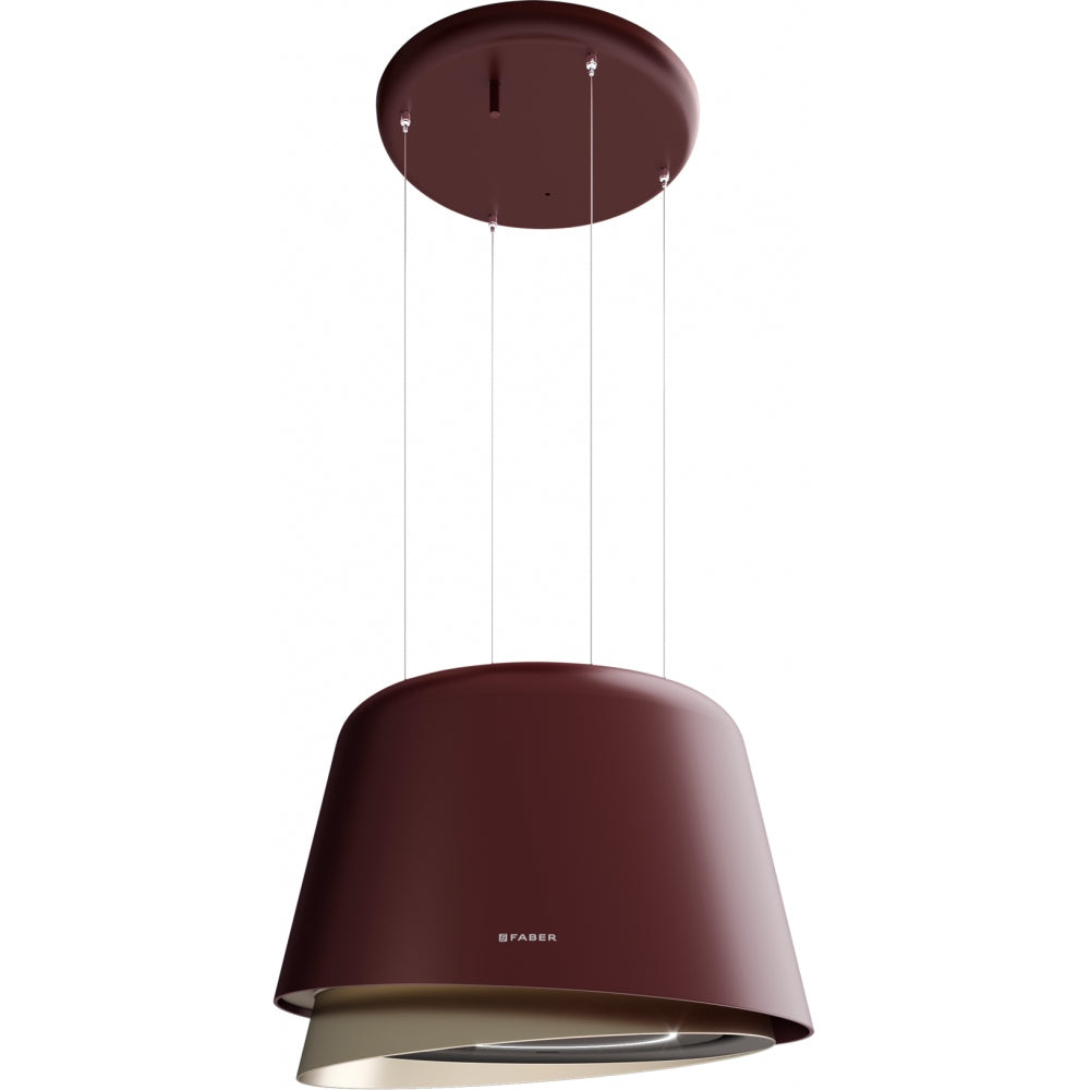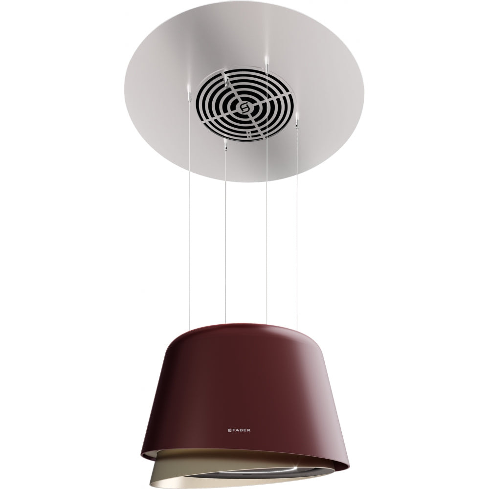 Podwieszany okap BELLE BURGUNDY/GOLD w kolorze burgund/złoty, dyfuzor EVO, opcja Airlane, pilot sterowania, technologia K-Link, efektywne oświetlenie LED, 640 m³/h, ø 69 cm.