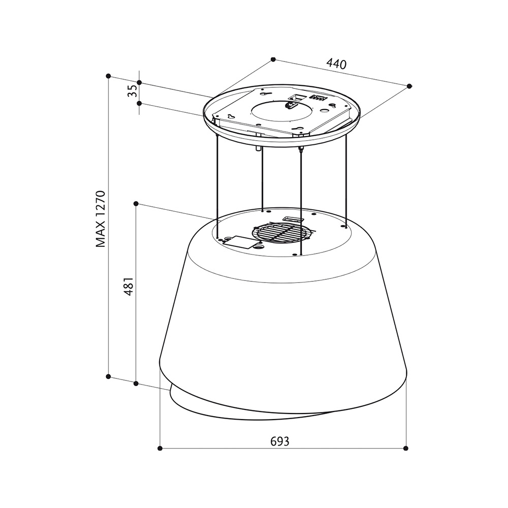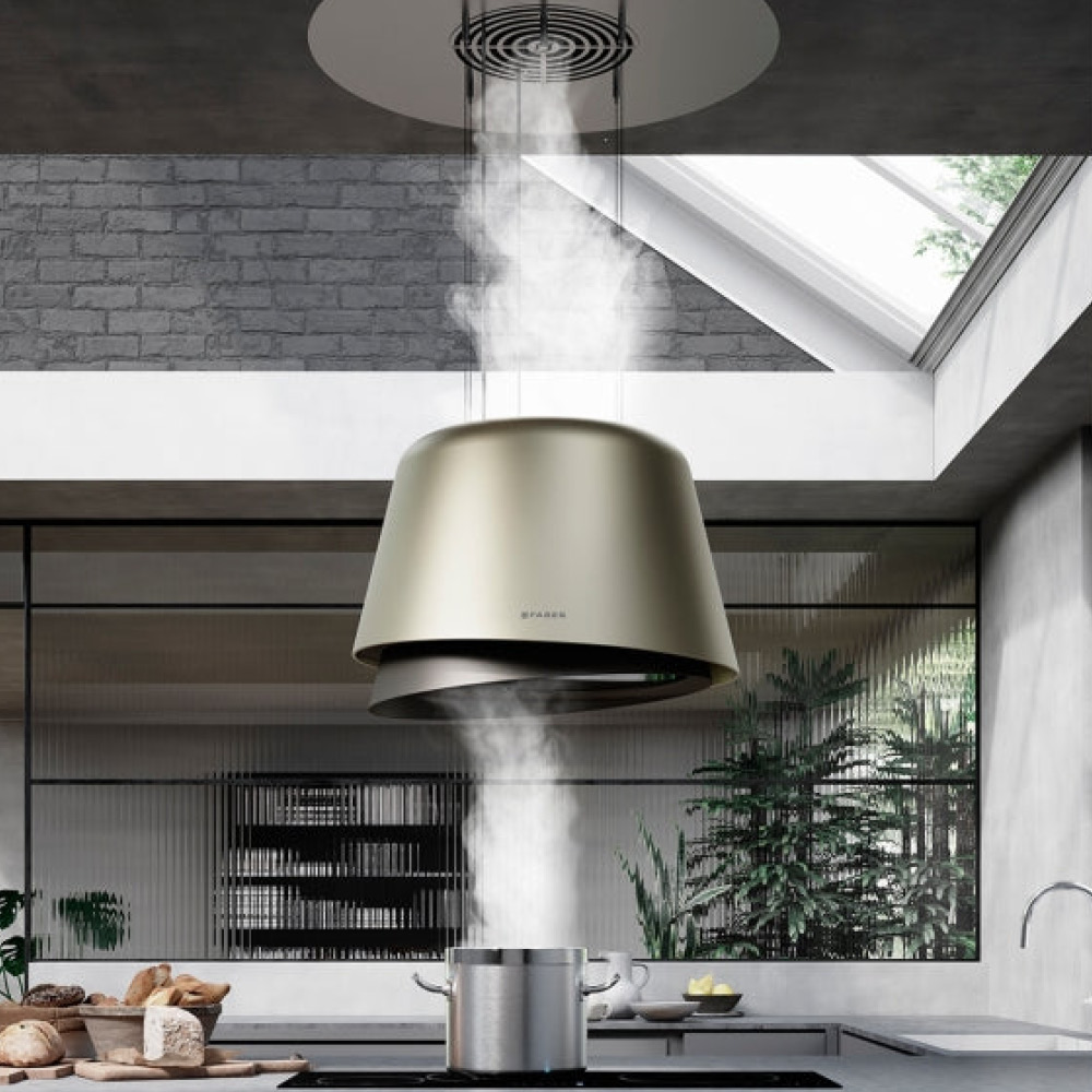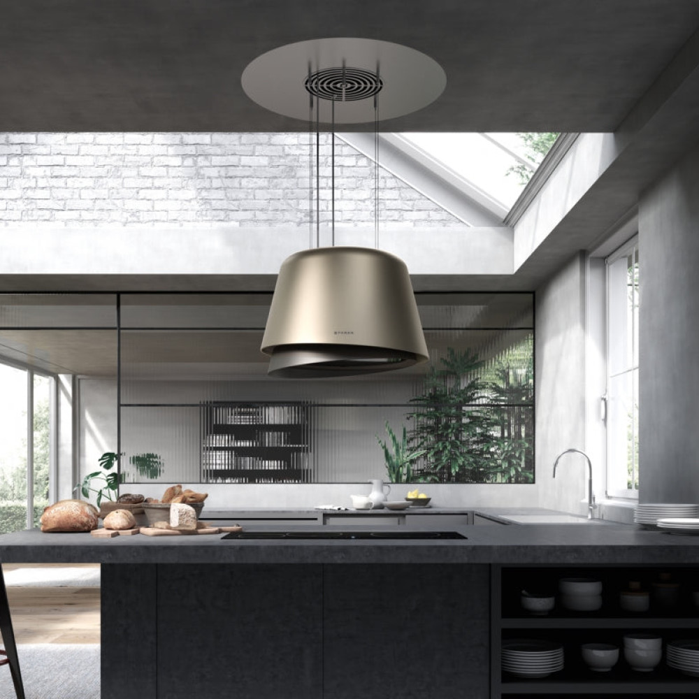 Podwieszany okap BELLE GOLD/WARM DG MATT w kolorze złoty mat/szary, funkcja UP & DOWN, dyfuzor EVO, opcja Airlane, pilot sterowania, technologia K-Link, efektywne oświetlenie LED, 640 m³/h, ø 69 cm.