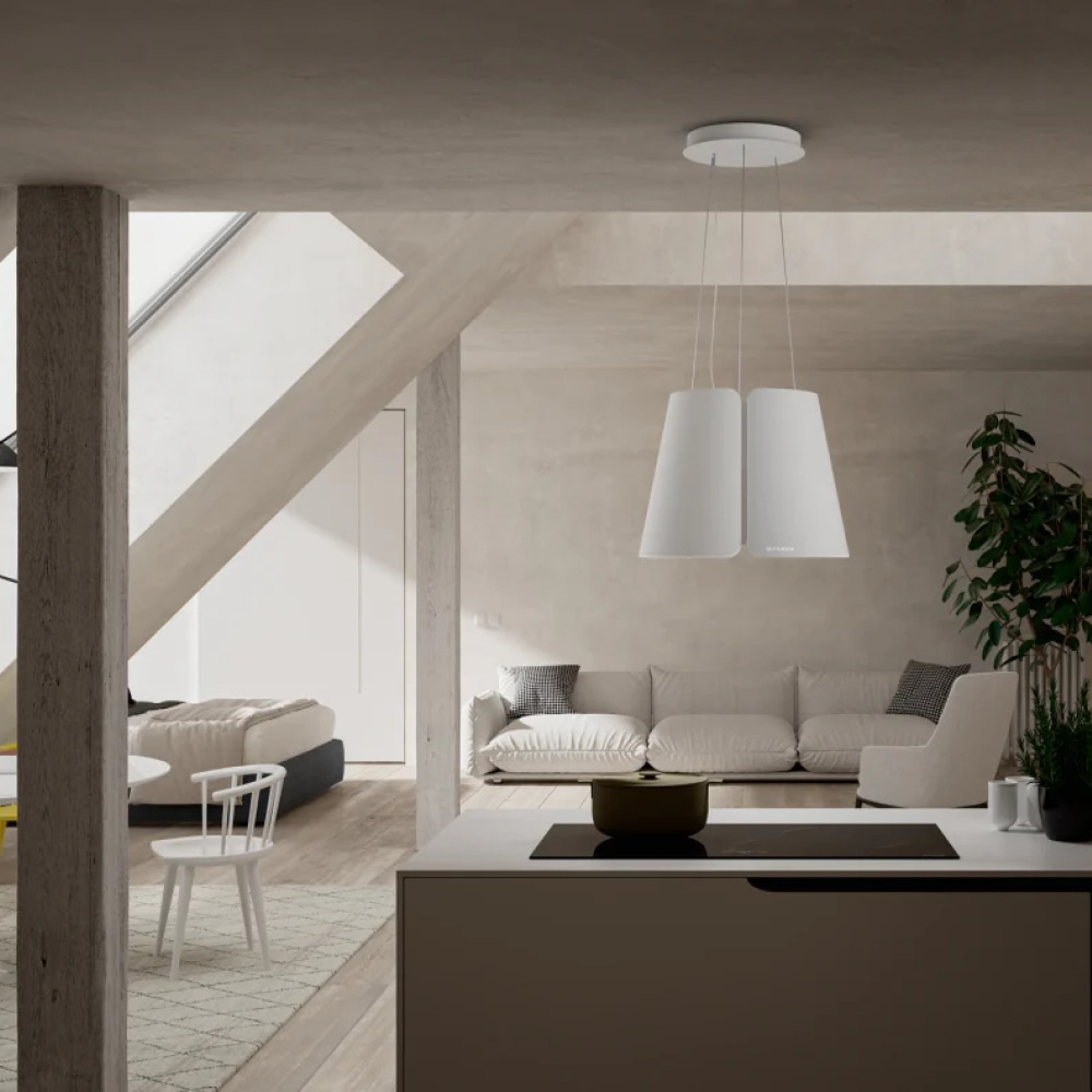 Wyspowy okap BEAT WH MATT F45 w kolorze biały mat, efektywne oświetlenie LED, 740 m³/h, ø 43 cm.