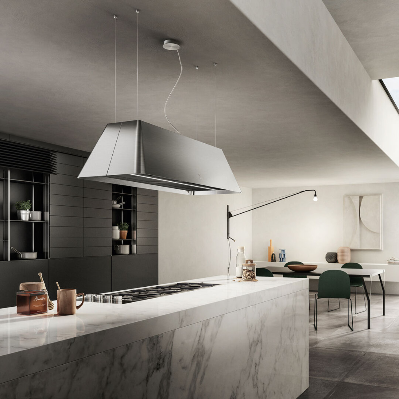 Ikona Maxxi Pure jest dostępna w wykończeniach w kolorze czarnym z efektem soft touch lub stal nierdzewna i oferuje szeroką gamę sposobów instalacji: pochłanianie lub filtrowanie, montaż ścienny lub zwieszany, z kominem wyciągowym lub bez i może być umieszczona zarówno z prawej, jak i z lewej strony.