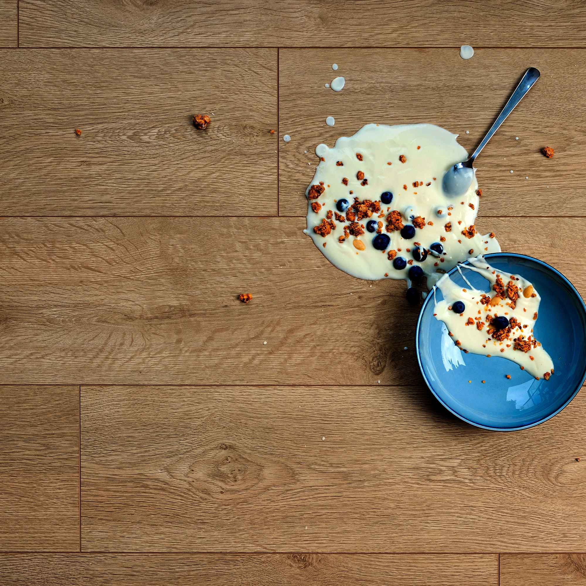 Wypadek? Nie ma powodu do zmartwień. Powierzchnia laminowanych paneli BerryAlloc nie wchłania żadnych płynów, dzięki czemu są w pełni odporne na zachlapania. W połączeniu z hydrofobową powłoką hydro+, która dodatkowo chroni krawędzie paneli, kompaktowym systemem zamków i specjalistycznymi akcesoriami hydro+ stosowanymi po obwodzie pomieszczenia, zyskujesz w 100% wodoodporną podłogę, która zniesie wszelkie zachlapania. Właśnie tak! Możesz wybrać poziom wodoodporności, co sprawia, że podłoga idealnie dopasuje się do każdego pomieszczenia.