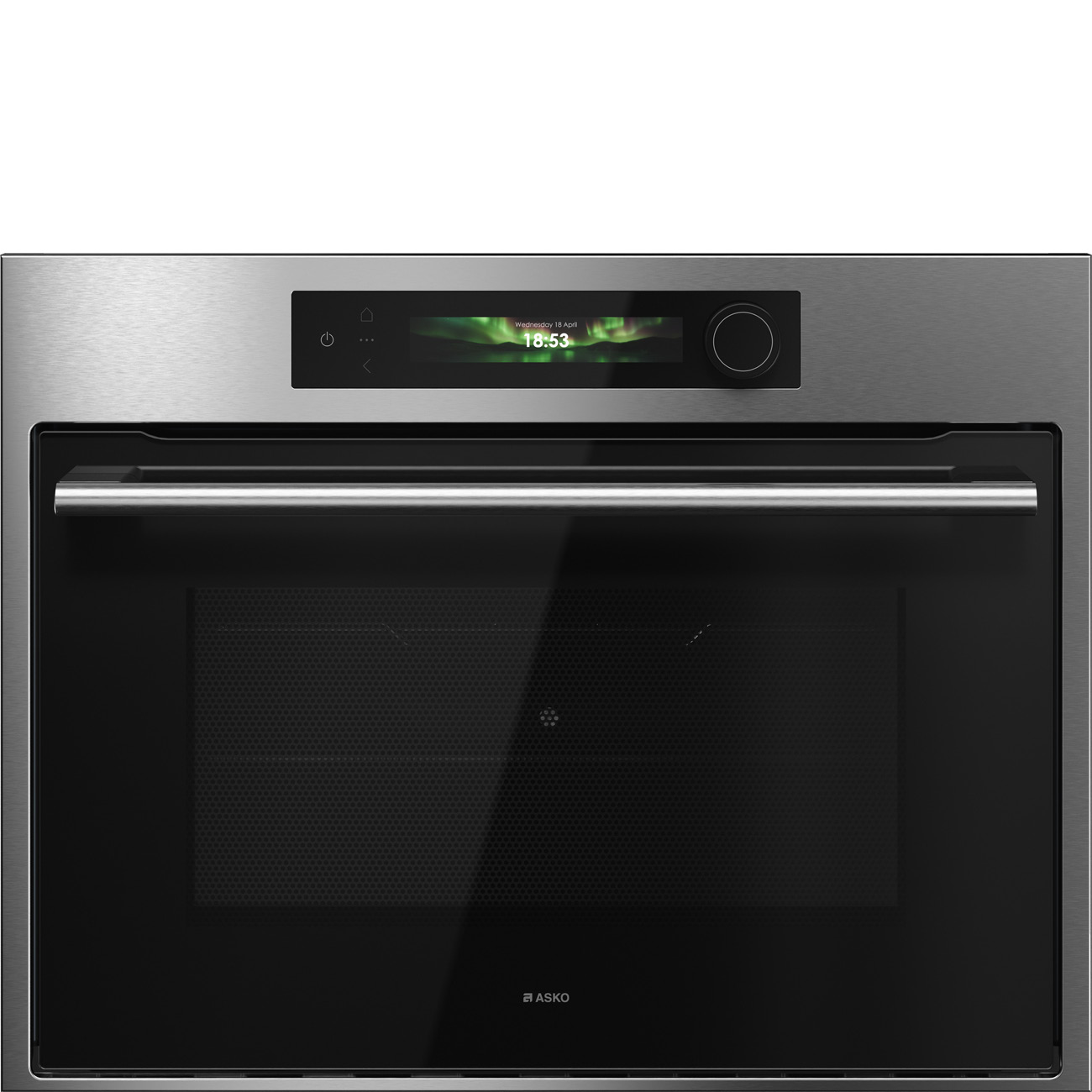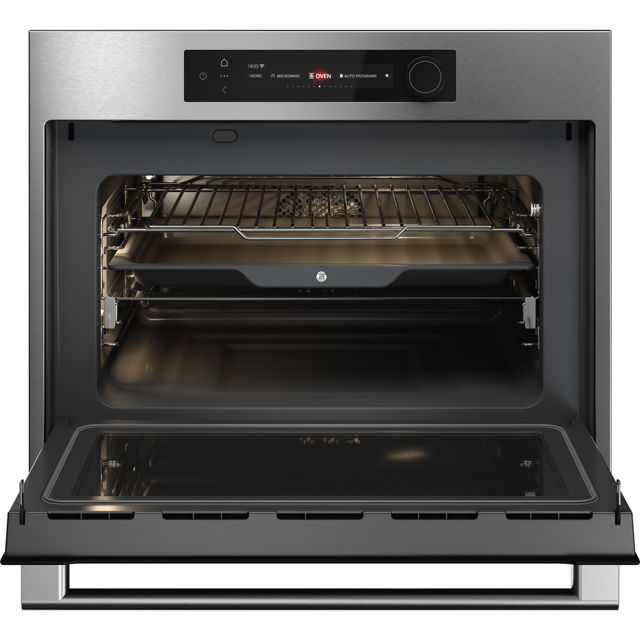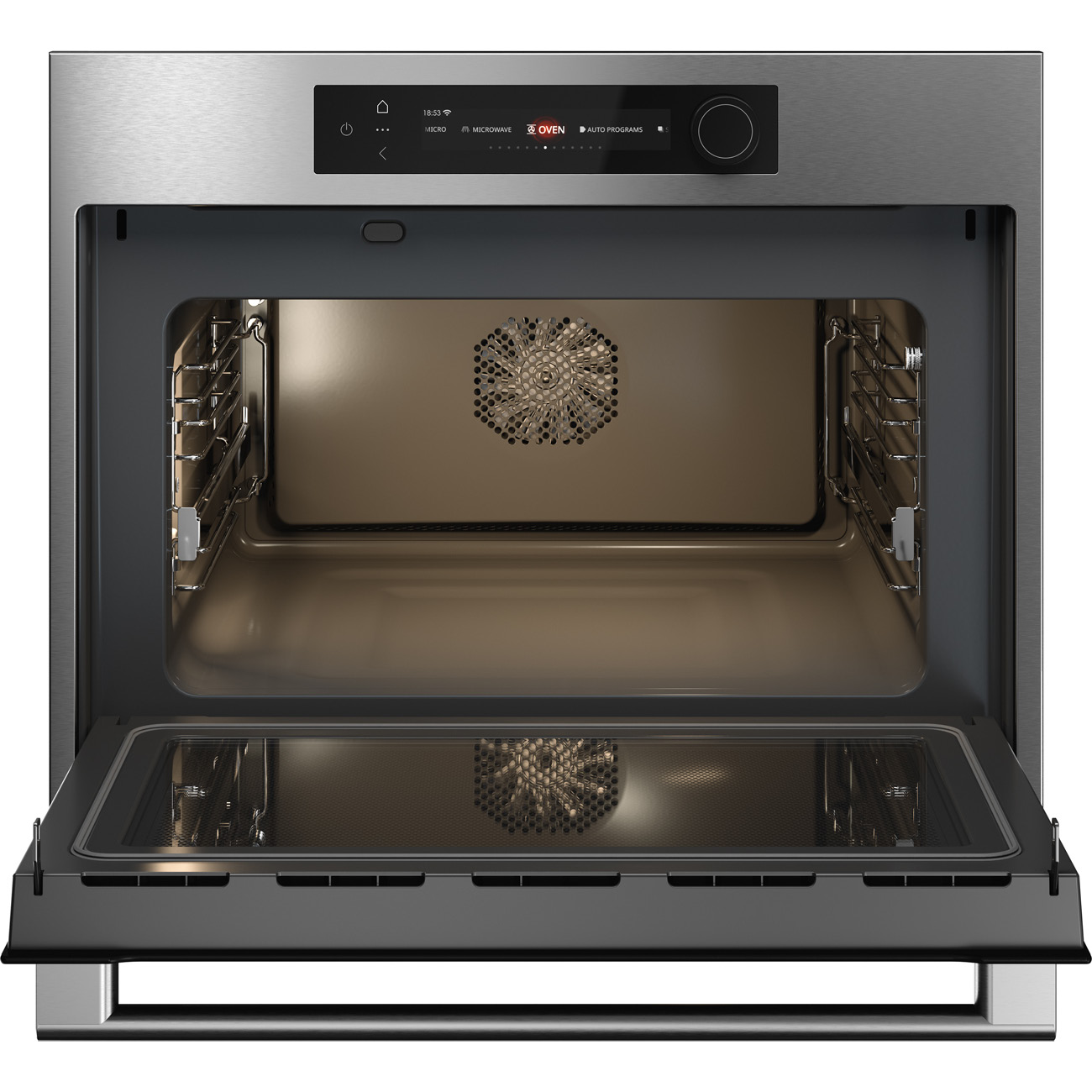 Piekarnik kompaktowy z mikrofalówką do zintegrowanej zabudowy w kolorze inox, kolorowy wyświetlacz BIO24 TFT CRAFT z funkcyjnym pokrętłem, termosonda, system Multi, prowadnice teleskopowe na jednym poziomie, zawiasy Dual Soft Close, czyszczenie mikrofalowe.