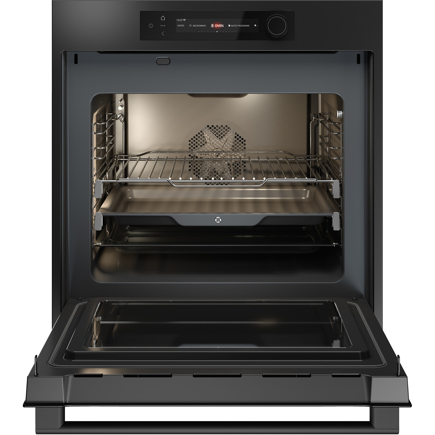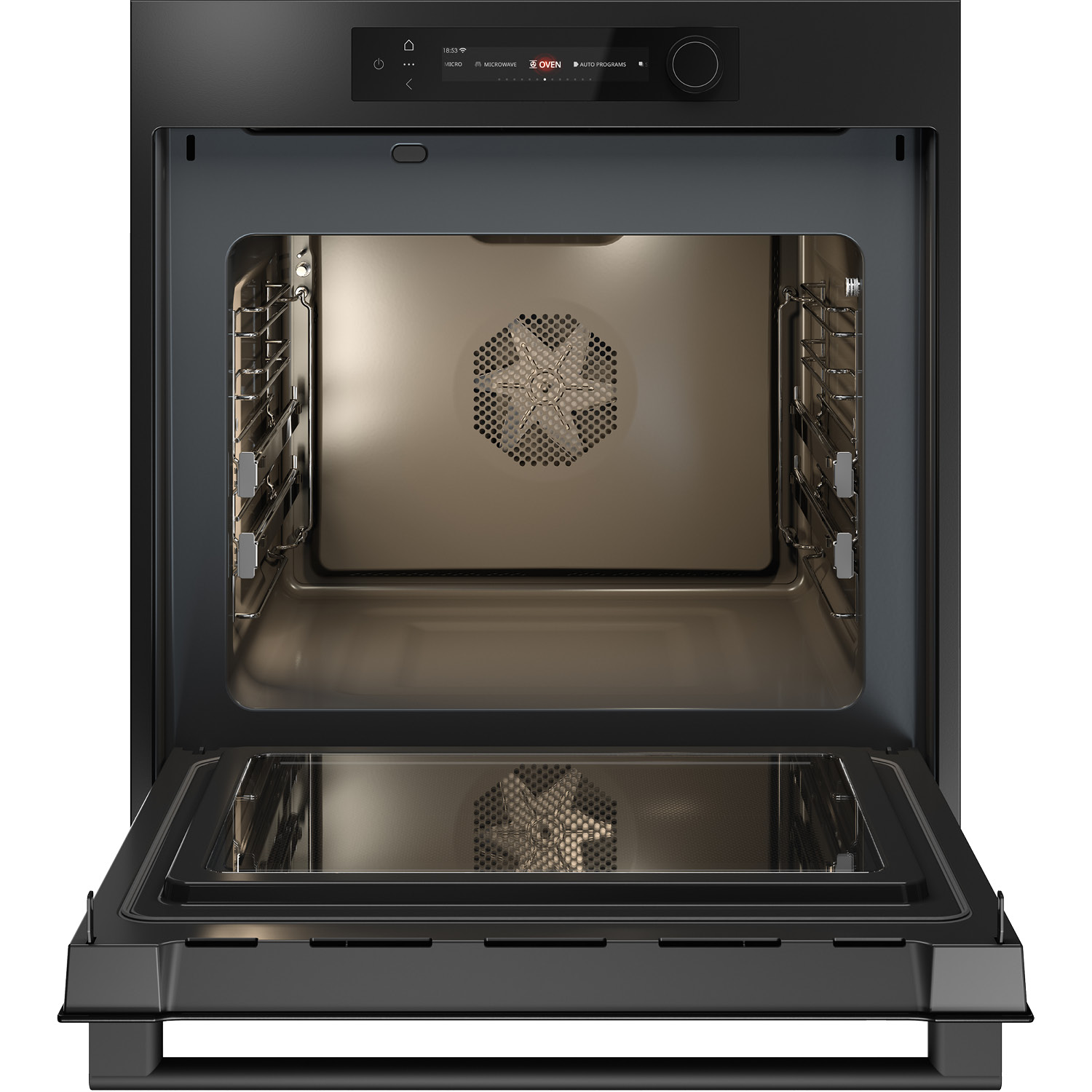 Piekarnik z mikrofalówką do zintegrowanej zabudowy w kolorze grafitowo-czarnym, 71 l, kolorowy wyświetlacz BIO24 TFT CRAFT z funkcyjnym pokrętłem, termosonda, system Multi, prowadnice teleskopowe na jednym poziomie, zawiasy Dual Soft Close, czyszczenie mikrofalowe.