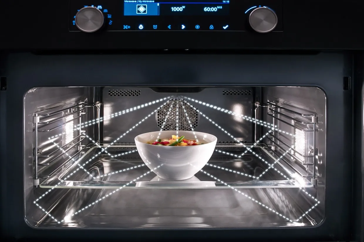 Wentylator Microwave Stirrer rozprowadza fale równomiernie w piekarniku, zmniejszając potrzebę stosowania talerza obrotowego. Uzyskaną dodatkową przestrzeń można zamiast tego wykorzystać do podgrzewania większych ilości żywności.