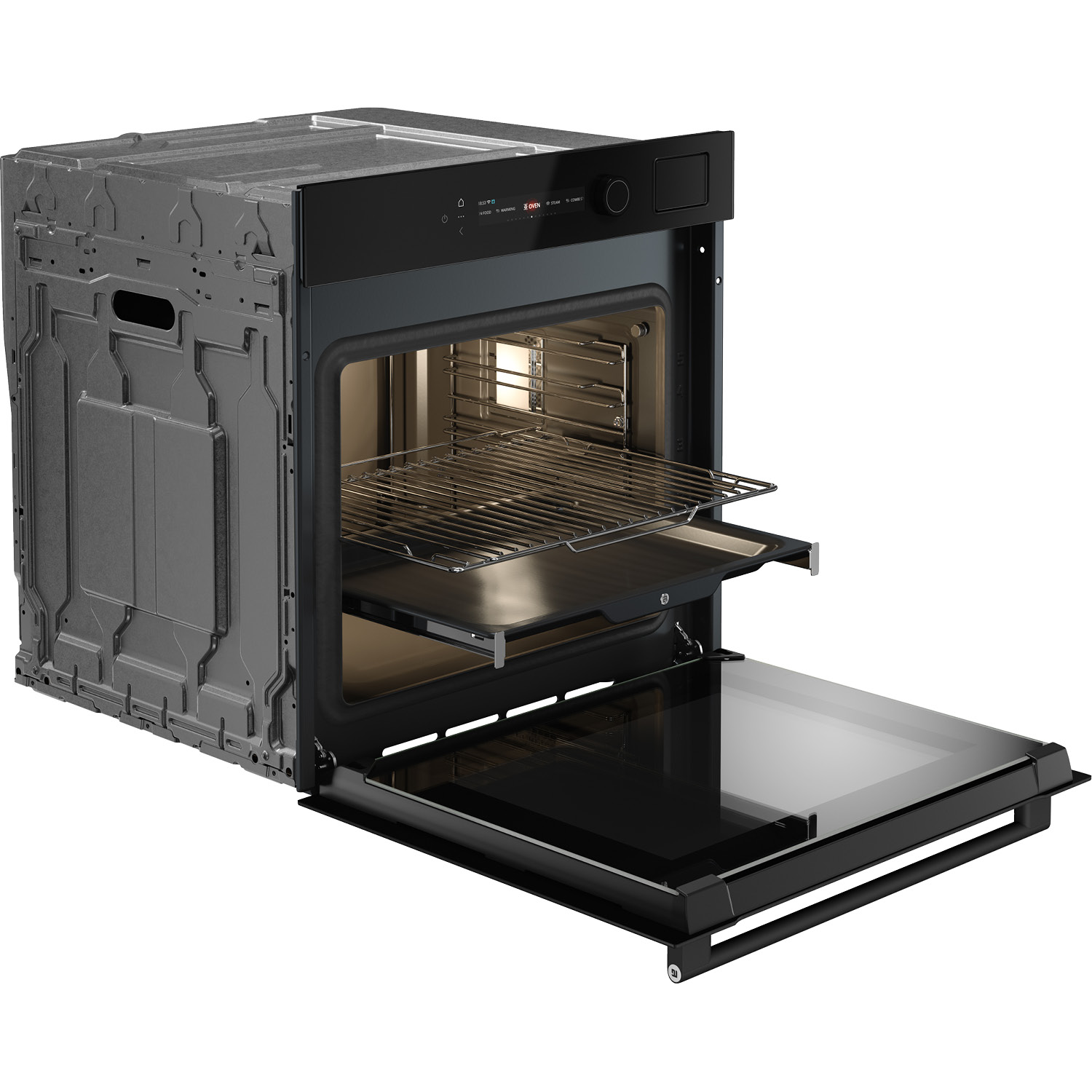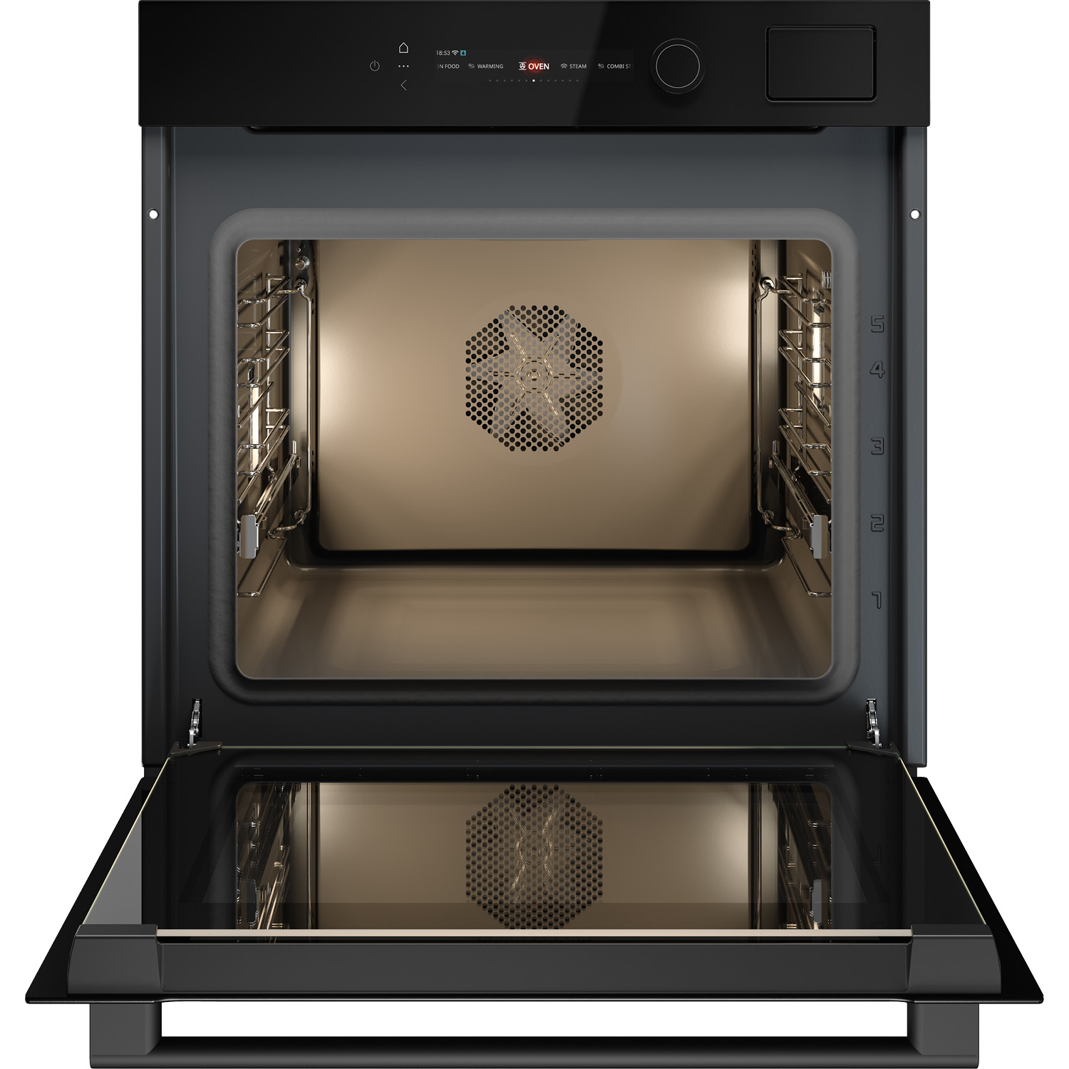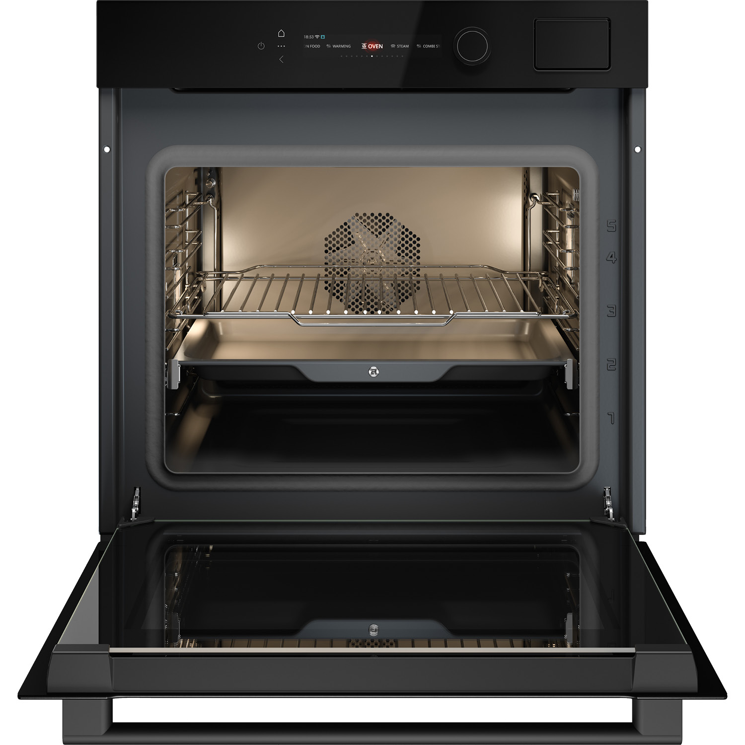 Piekarnik z funkcją gotowania na parze do zintegrowanej zabudowy w kolorze czarne szkło, 71 l, kolorowy wyświetlacz BIO24 TFT CRAFT z funkcyjnym pokrętłem, termosonda, system Multi, prowadnice teleskopowe na jednym poziomie, zawiasy Dual Soft Close, czyszczenie parowe.