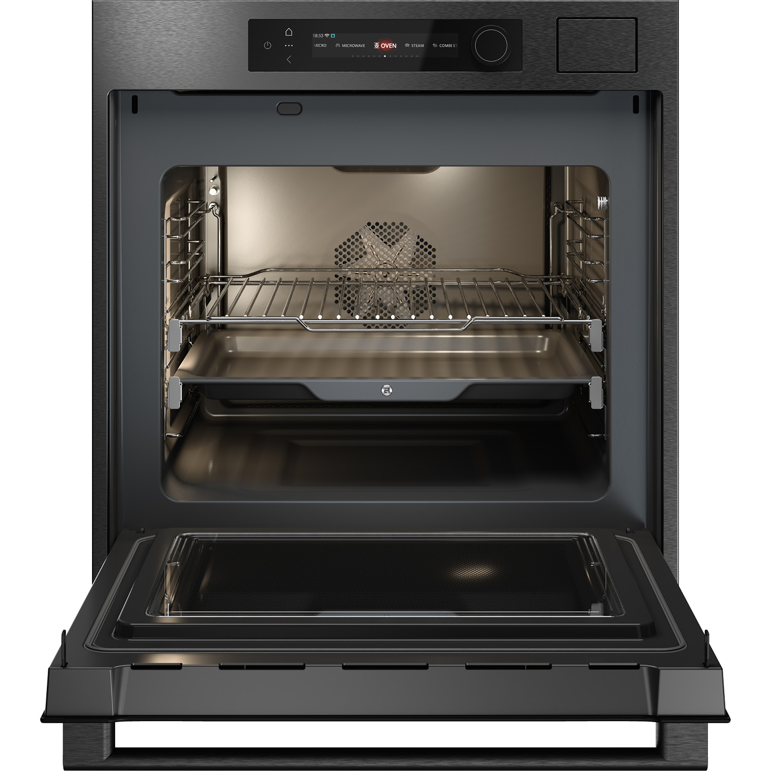 Piekarnik z mikrofalówką i funkcją gotowania na parze do zintegrowanej zabudowy w kolorze black inox, 71 l, kolorowy wyświetlacz BIO24 TFT CRAFT z funkcyjnym pokrętłem, termosonda, system Multi, prowadnice teleskopowe na jednym poziomie, zawiasy Dual Soft Close, czyszczenie parowe.