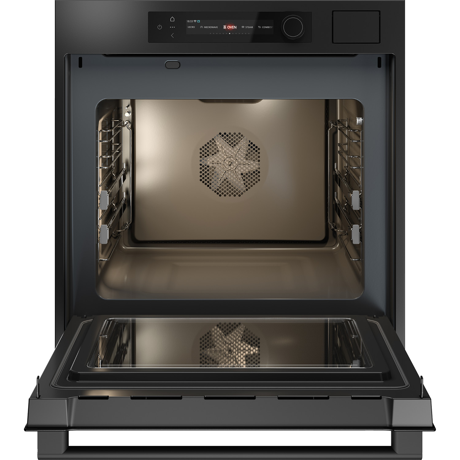 Piekarnik z mikrofalówką i funkcją gotowania na parze do zintegrowanej zabudowy w kolorze grafitowo-czarnym, 71 l, kolorowy wyświetlacz BIO24 TFT CRAFT z funkcyjnym pokrętłem, termosonda, system Multi, częściowo wysuwalne prowadnice teleskopowe na jednym poziomie, zawiasy Dual Soft Close, czyszczenie parowe.