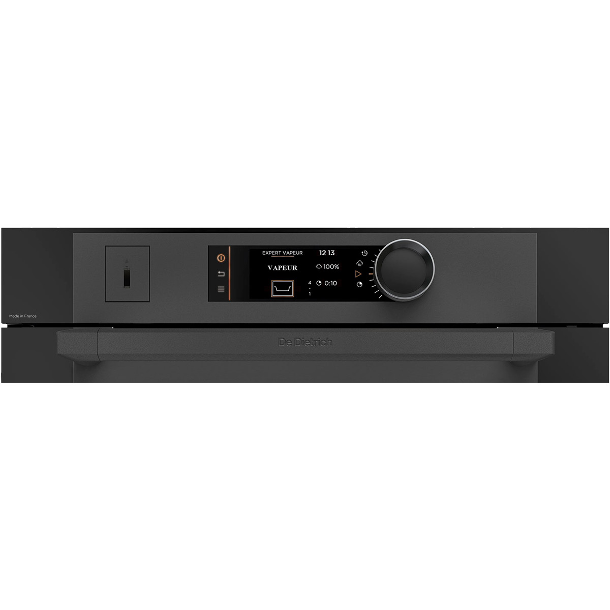 Piekarnik multifunkcyjny firmy De Dietrich do zintegrowanej zabudowy z serii COAL BLACK, w kolorze czarnym, przewodnik kulinarny, pieczenie w niskiej temperaturze, gotowanie na parze z automatycznym otwieraniem zbiornika na wodę o pojemności 1,2 litra z podświetlanym wskaźnikiem poziomu wody, czyszczenie pyrolityczne, A+, 73 l.