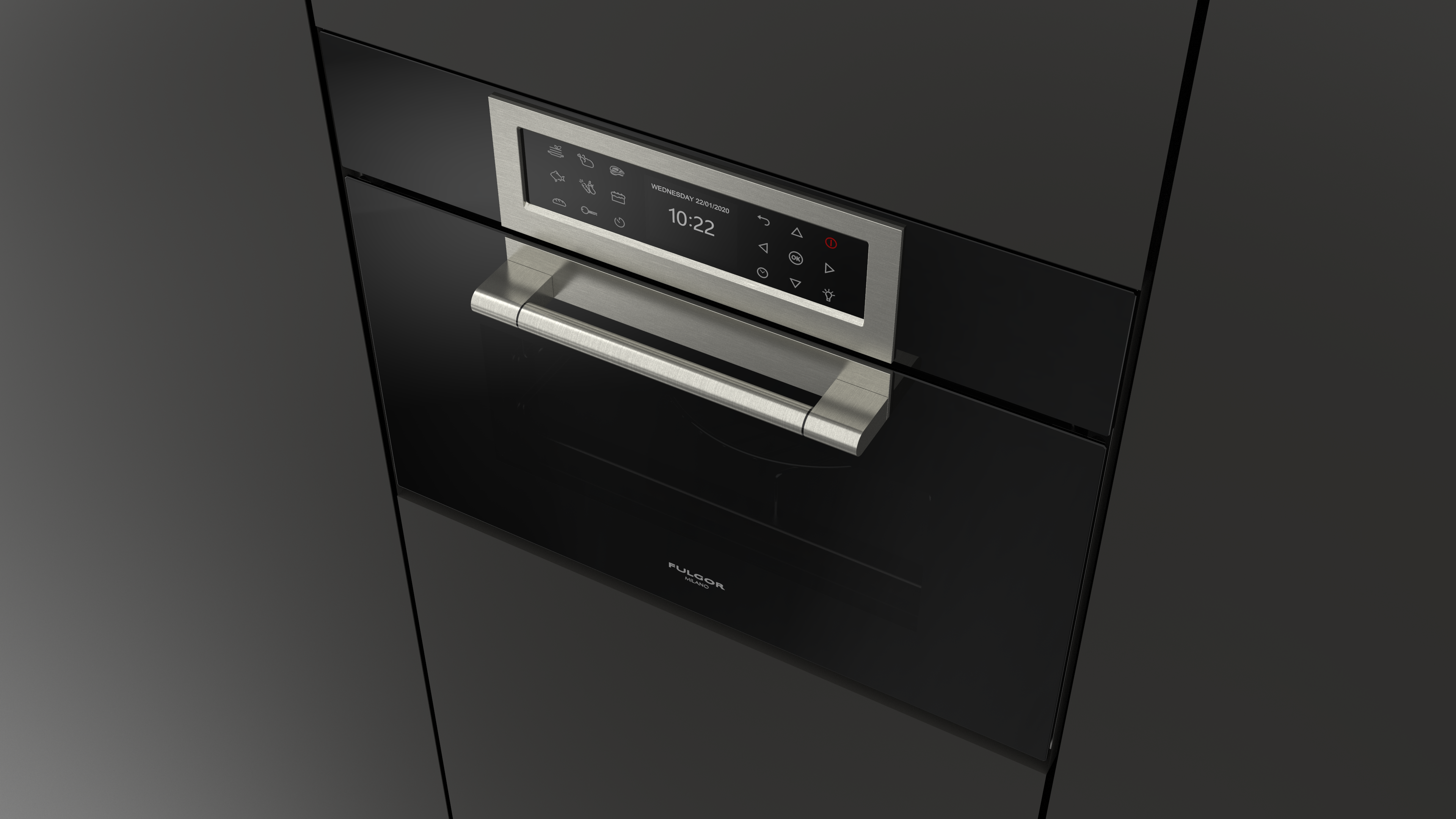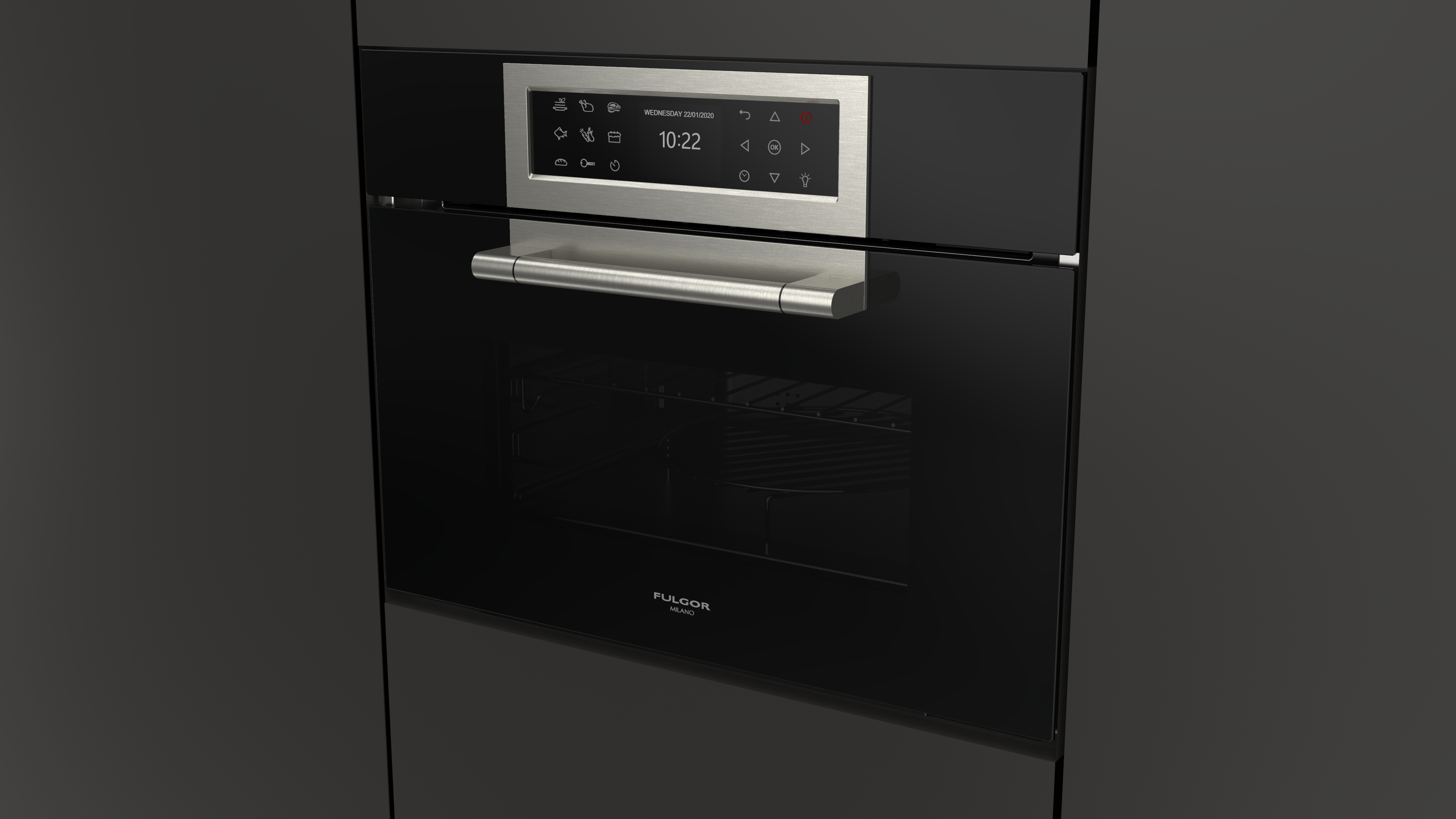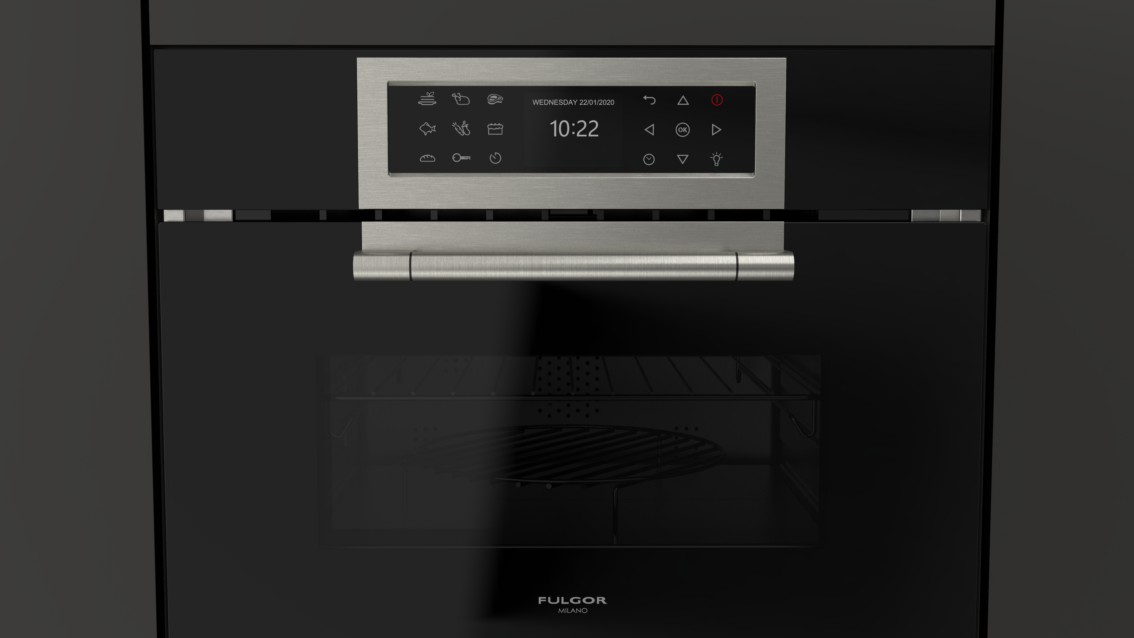 Piekarnik z funkcją mikrofali Fulgor Milano FCLCMO 4510 TEM BK z serii Cluster Concept, w kolorze czarnej lawy Obsidian Black Glass, o szerokości 60 cm, 34 l.