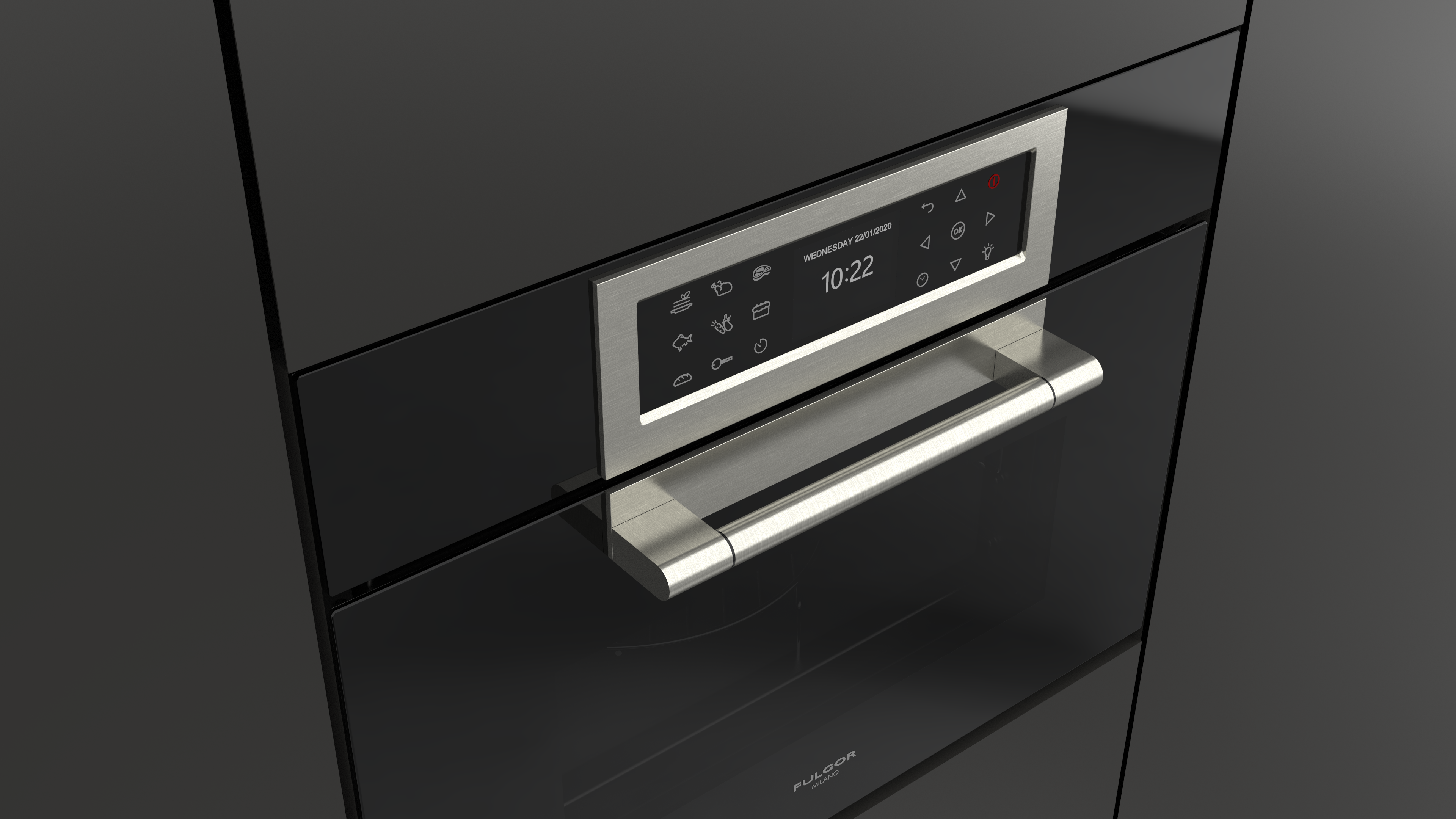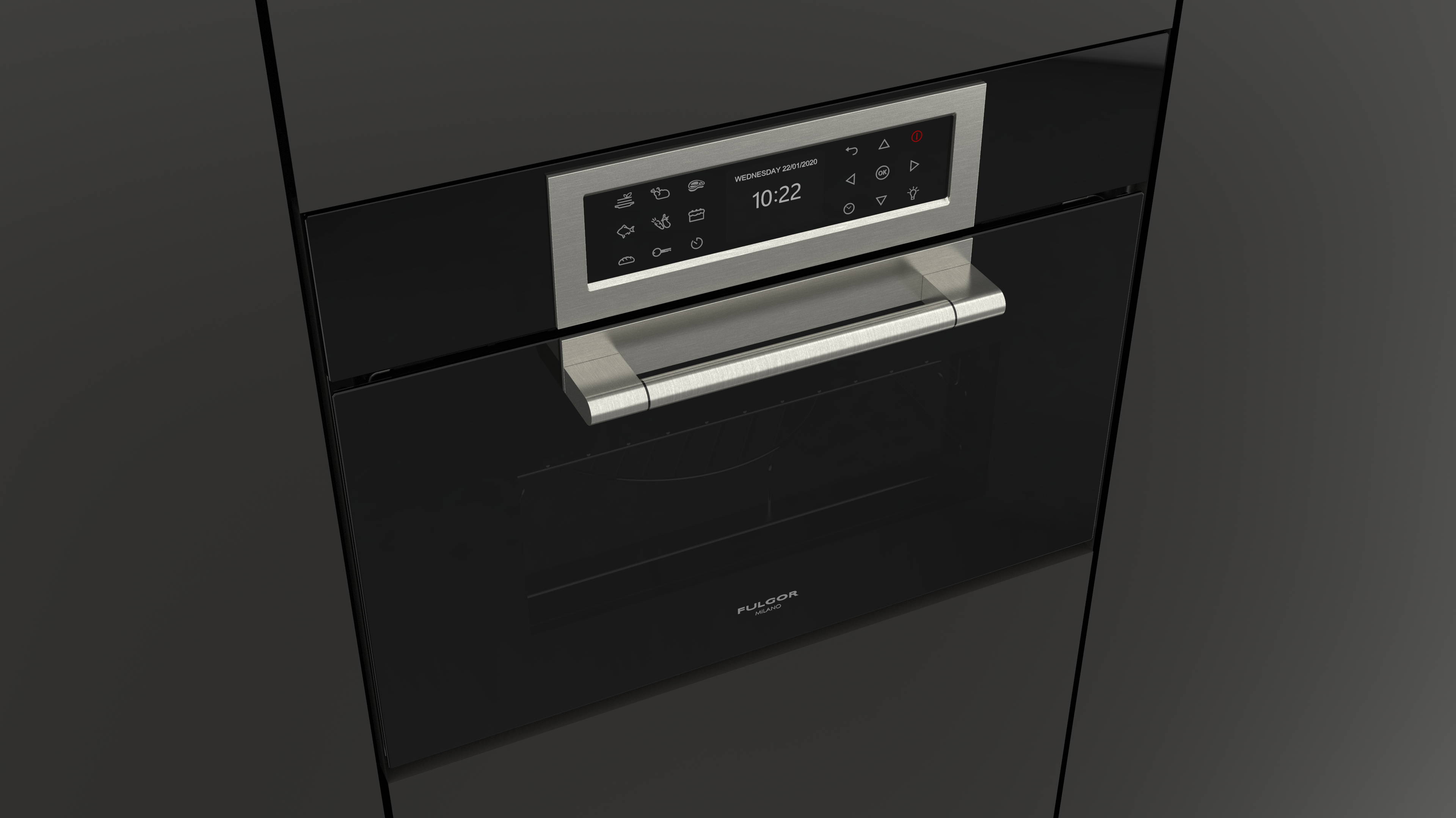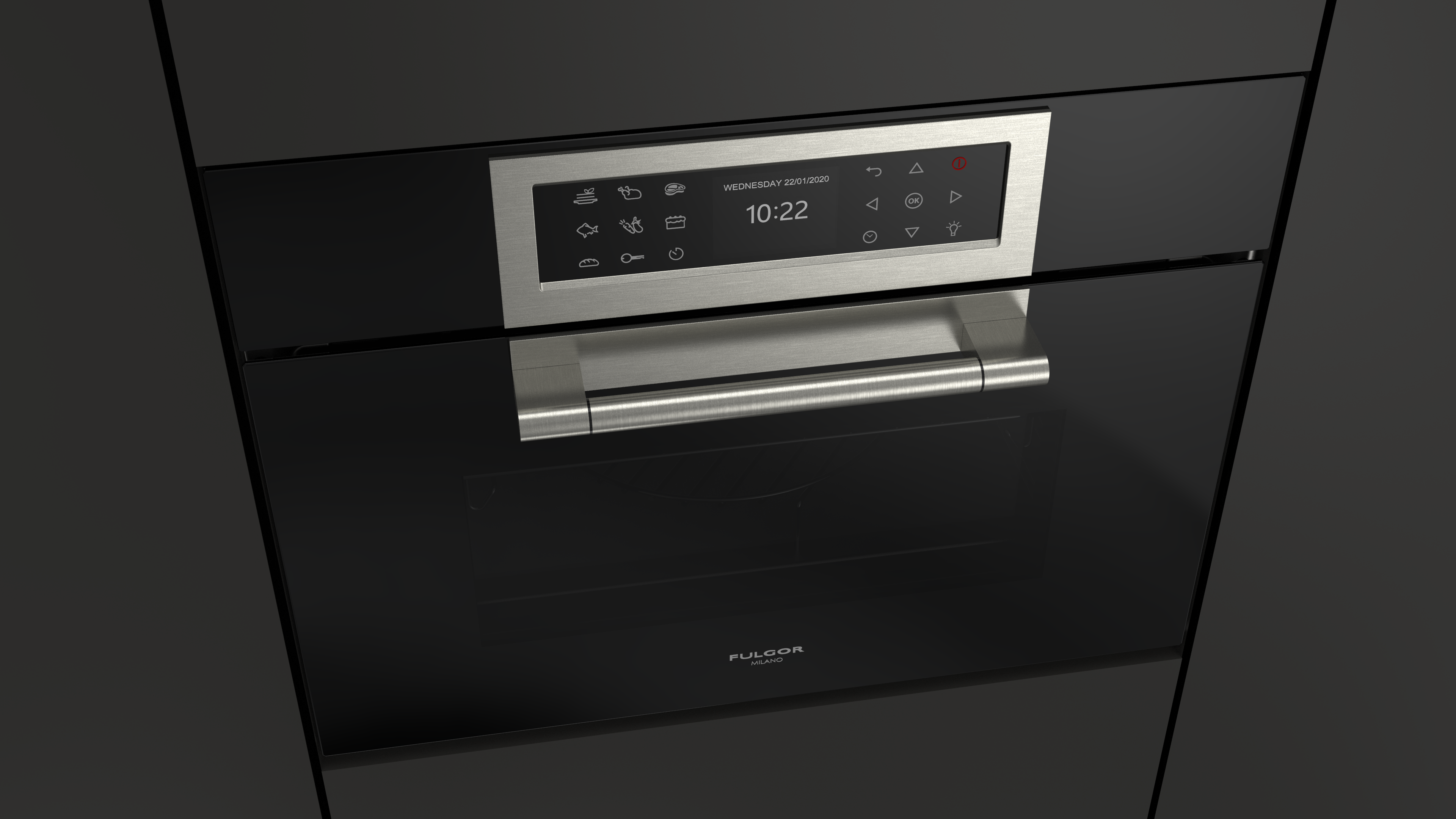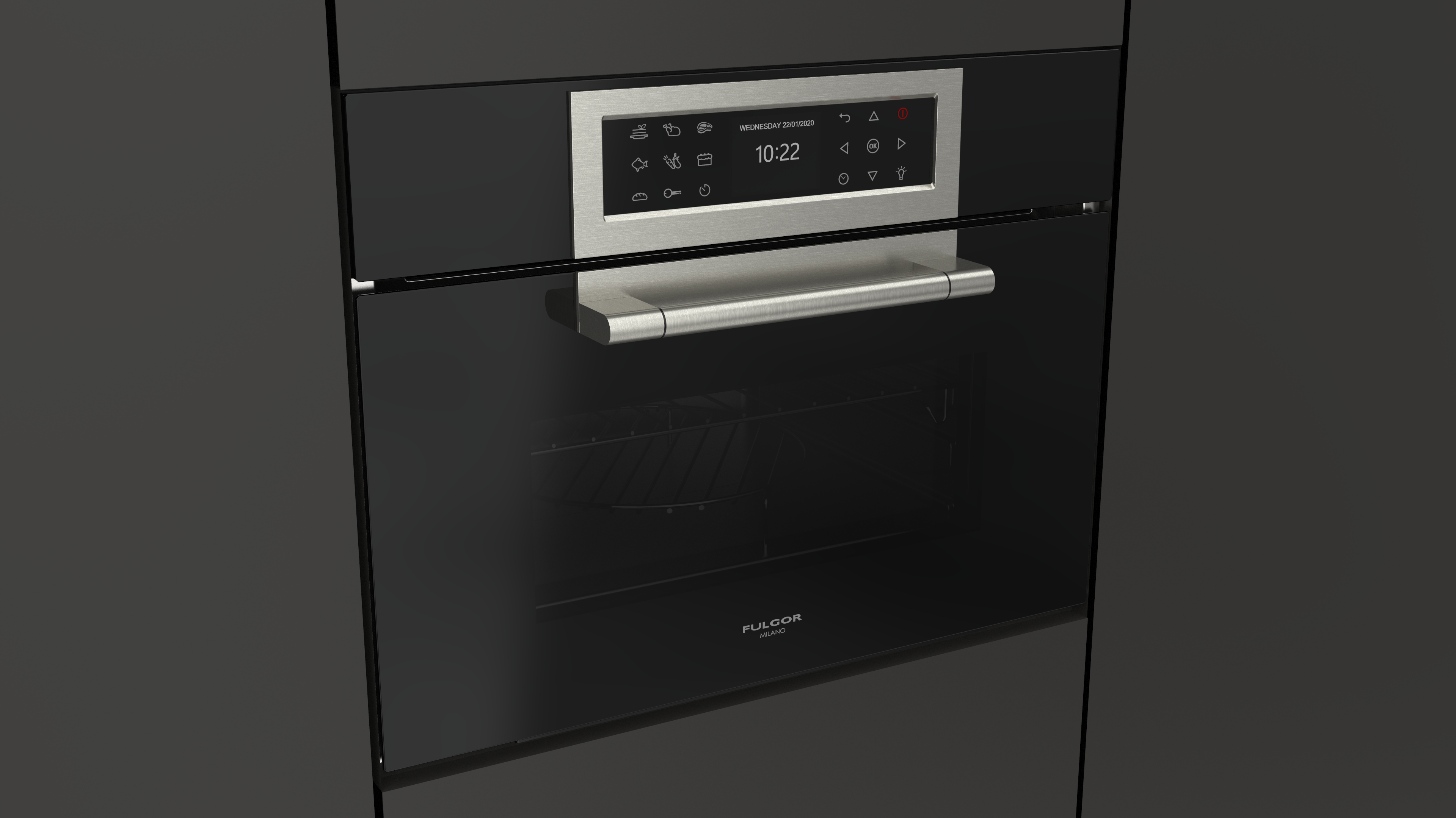 Piekarnik z funkcją mikrofali Fulgor Milano FCLCMO 4510 TEM BK z serii Cluster Concept, w kolorze czarnej lawy Obsidian Black Glass, o szerokości 60 cm, 34 l.