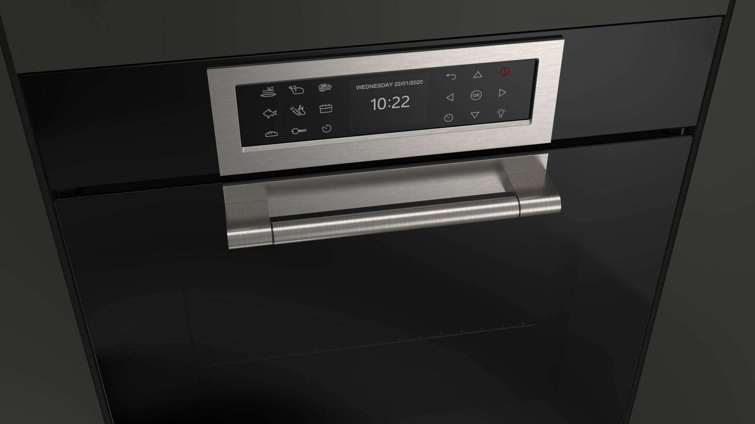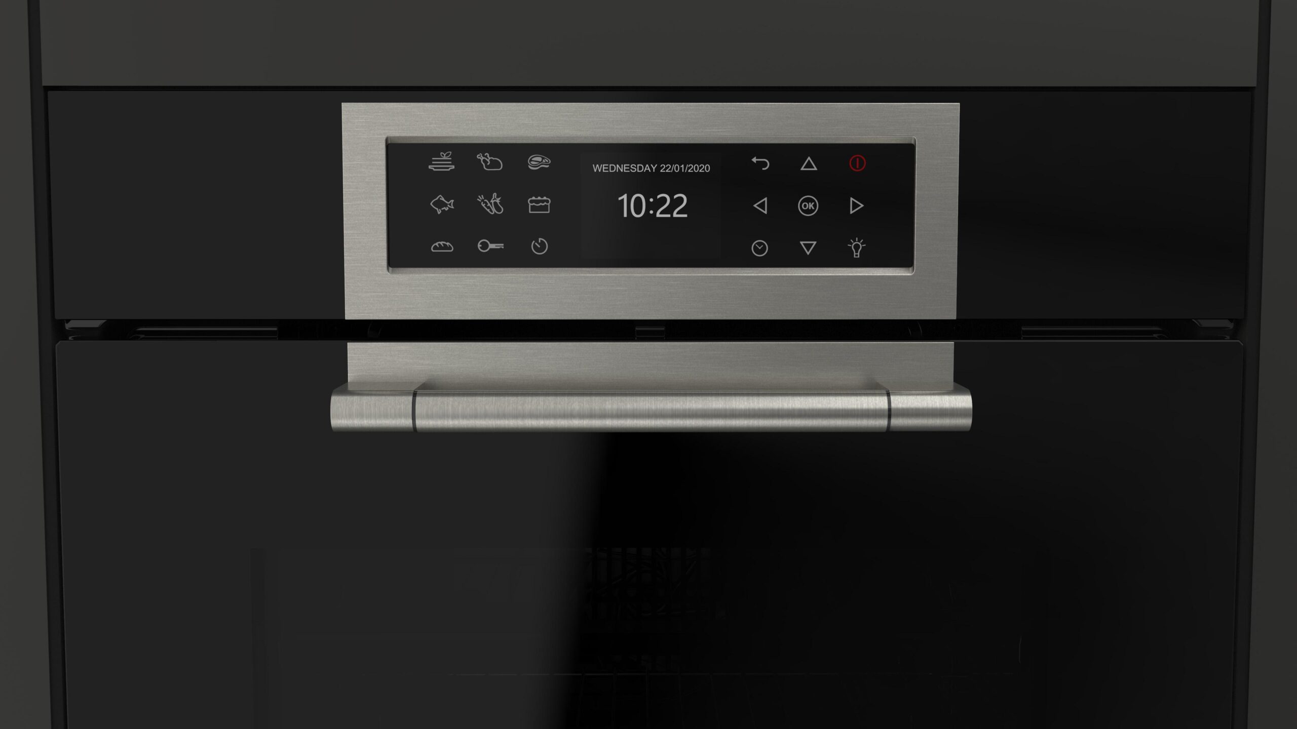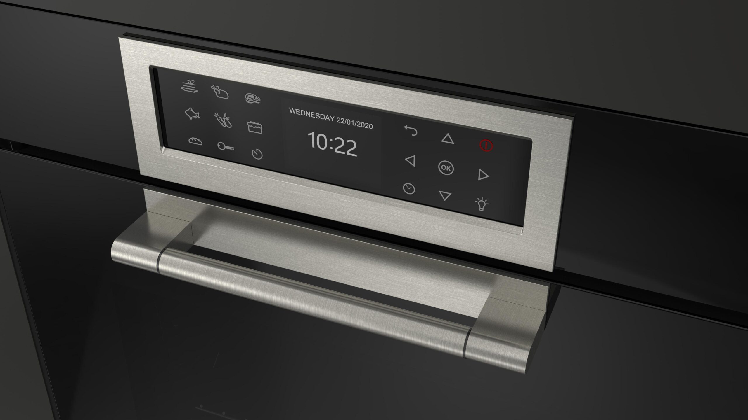 Użytkownik delikatnie naciska ikony po obydwu stronach ekranu na którym wyświetlają się wybrane parametry pracy piekarnika, takie jak czas i temperatura oraz elementy aktualnie pracujące (wentylator, czy grzałka). Wyświetlane elementy są bardzo czytelne i Użytkownik łatwo może zorientować się w postępach pieczenia swojej ulubionej potrawy.