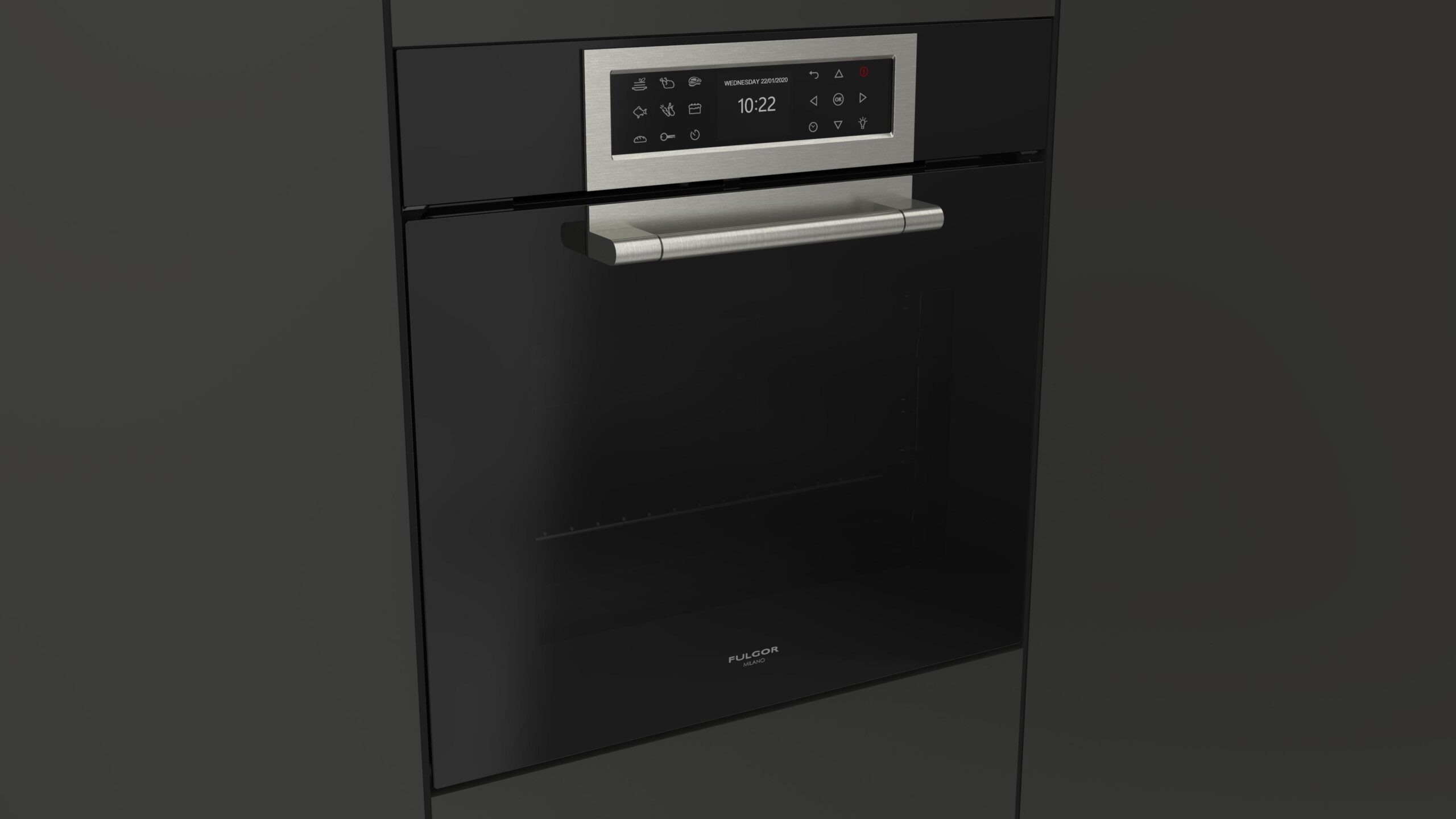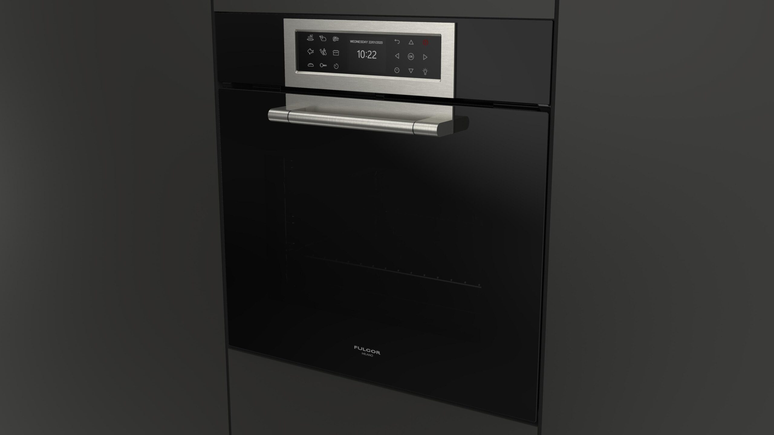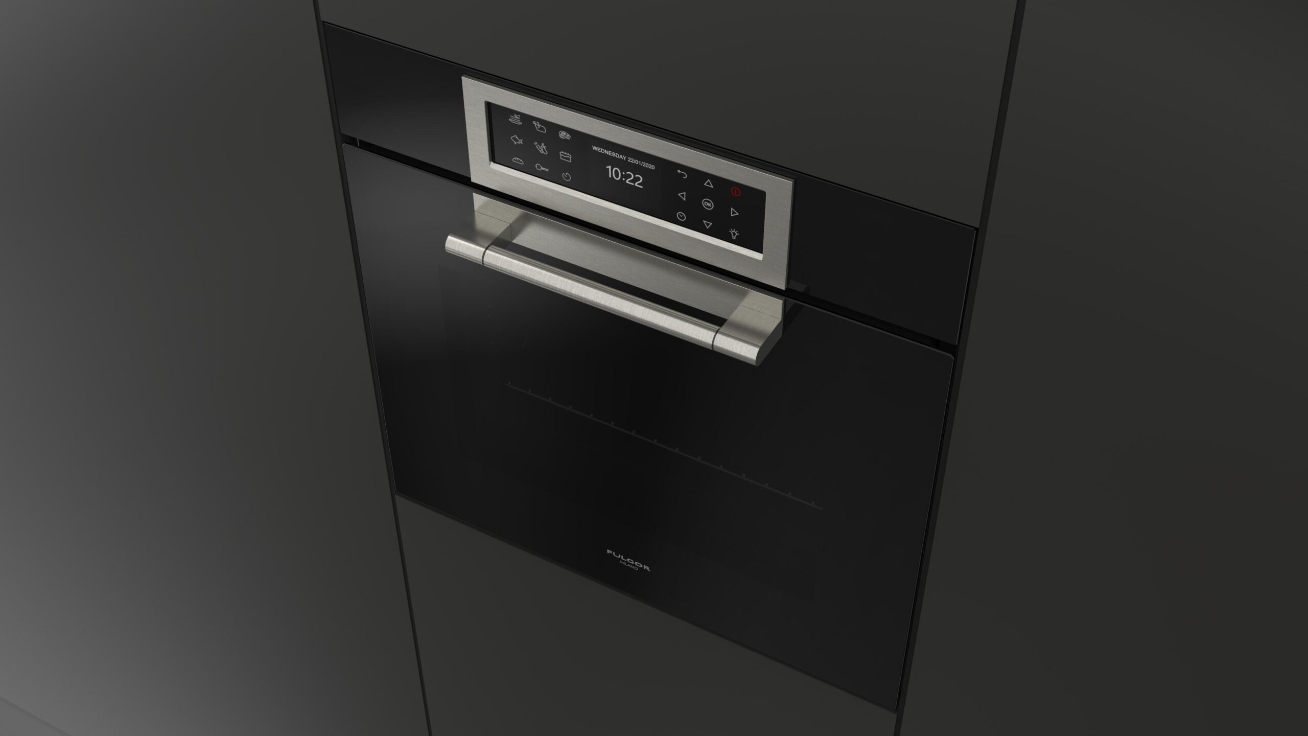 Wielofunkcyjny piekarnik Fulgor Milano FCLO 6215 TEM BK z serii Cluster Concept, w kolorze czarnej lawy Obsidian Black Glass, o szerokości 60 cm, A++, 65 l.