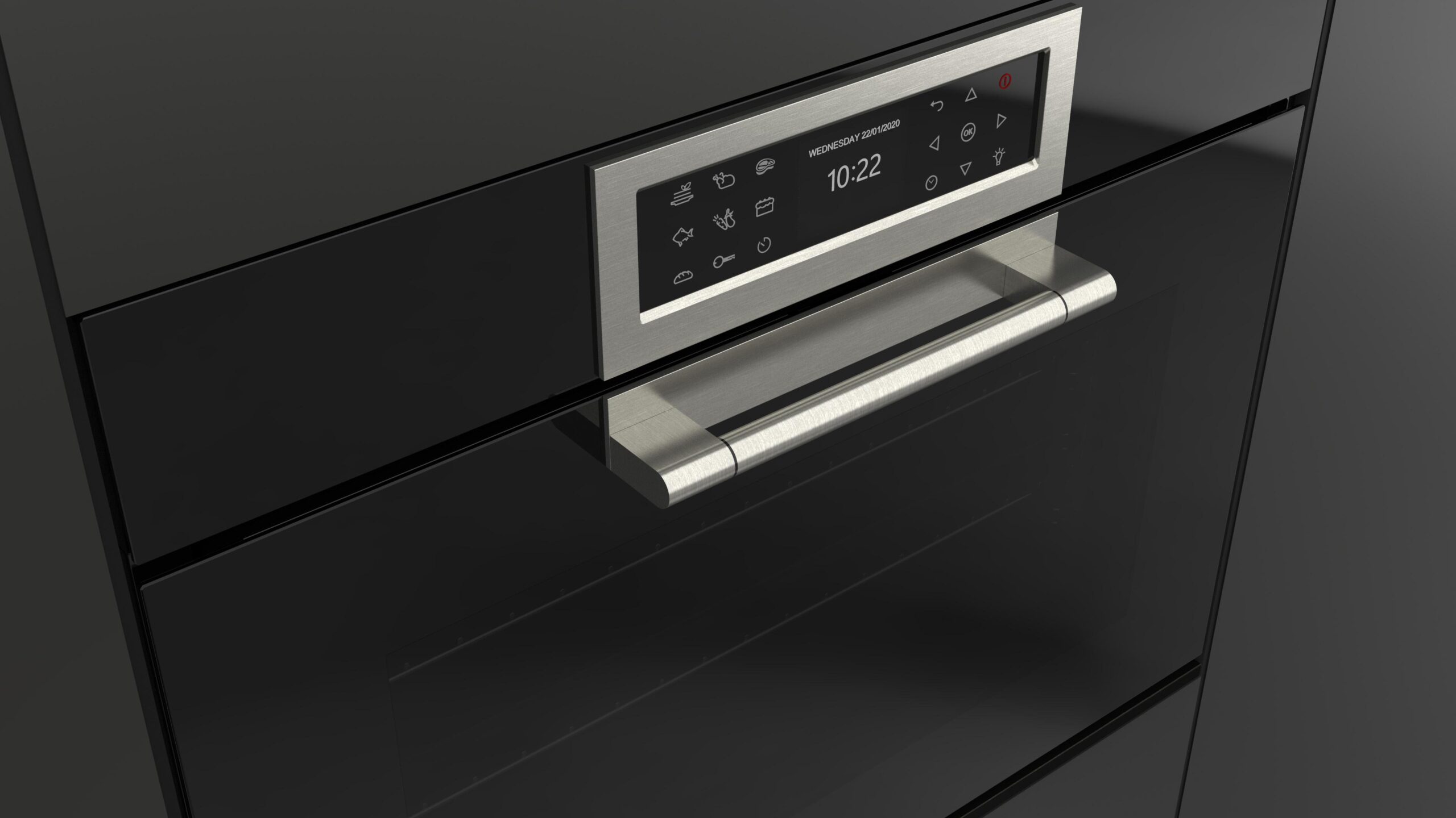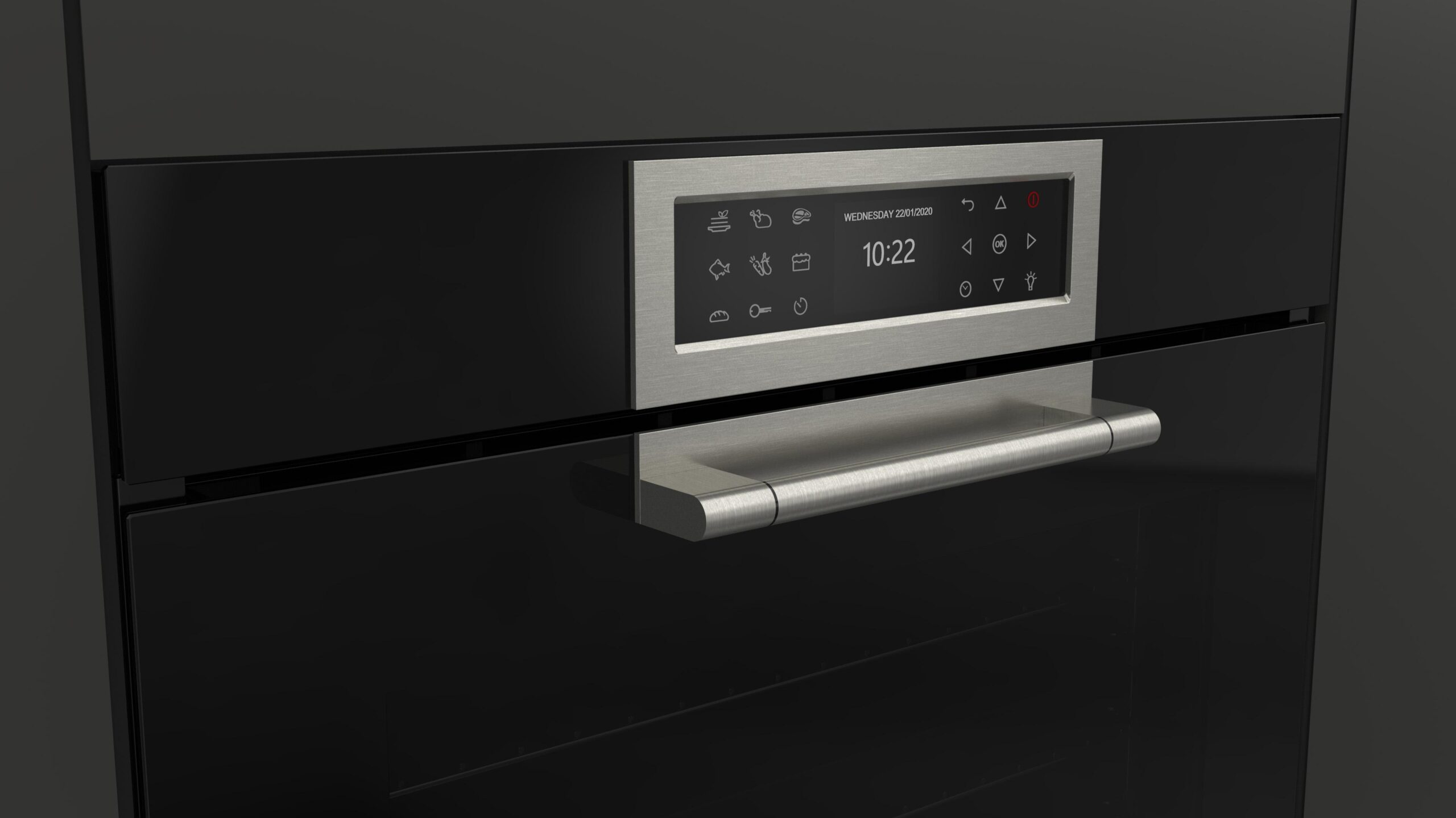 Użytkownik delikatnie naciska ikony po obydwu stronach ekranu na którym wyświetlają się wybrane parametry pracy piekarnika, takie jak czas i temperatura oraz elementy aktualnie pracujące (wentylator, czy grzałka). Wyświetlane elementy są bardzo czytelne i Użytkownik łatwo może zorientować się w postępach pieczenia swojej ulubionej potrawy.