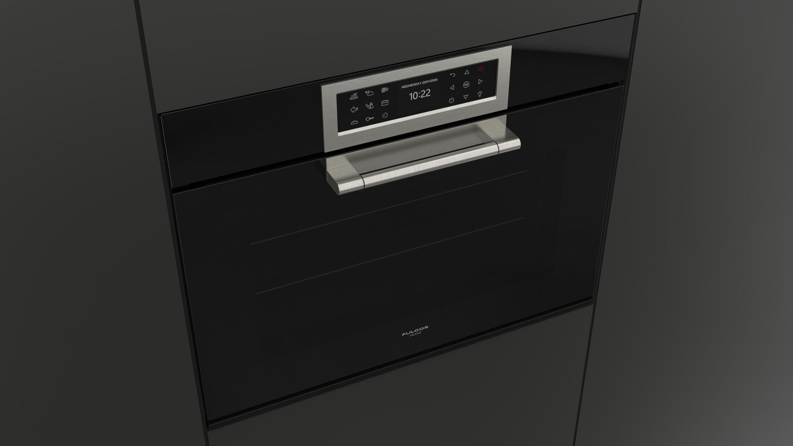 Wielofunkcyjny piekarnik Fulgor Milano FCLO 7515 TEM BK z serii Cluster Concept, w kolorze czarnej lawy Obsidian Black Glass, o szerokości 75 cm z rożnem obrotowym, A+, 89 l.
