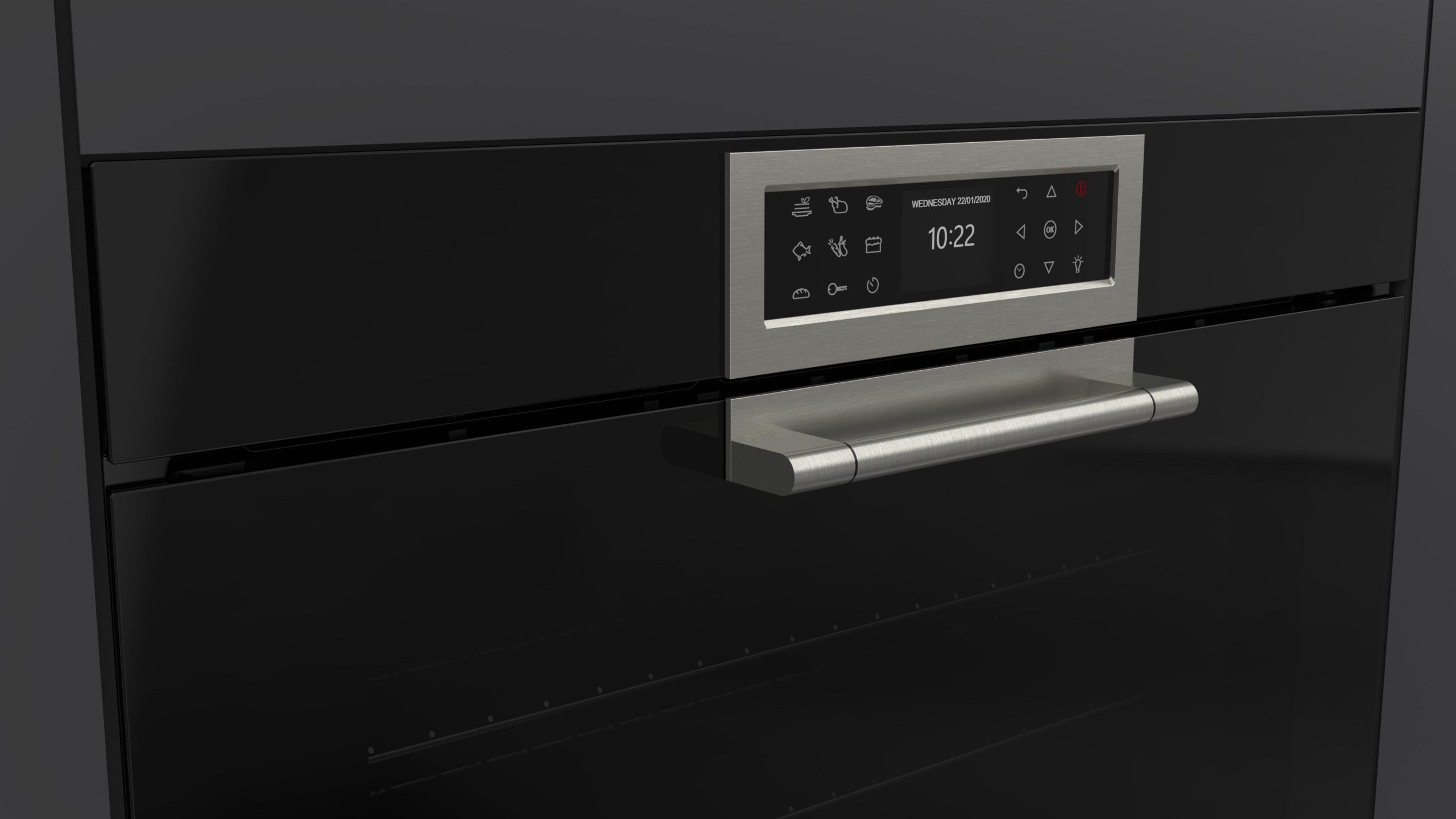Użytkownik delikatnie naciska ikony po obydwu stronach ekranu na którym wyświetlają się wybrane parametry pracy piekarnika, takie jak czas i temperatura oraz elementy aktualnie pracujące (wentylator, czy grzałka). Wyświetlane elementy są bardzo czytelne i Użytkownik łatwo może zorientować się w postępach pieczenia swojej ulubionej potrawy.