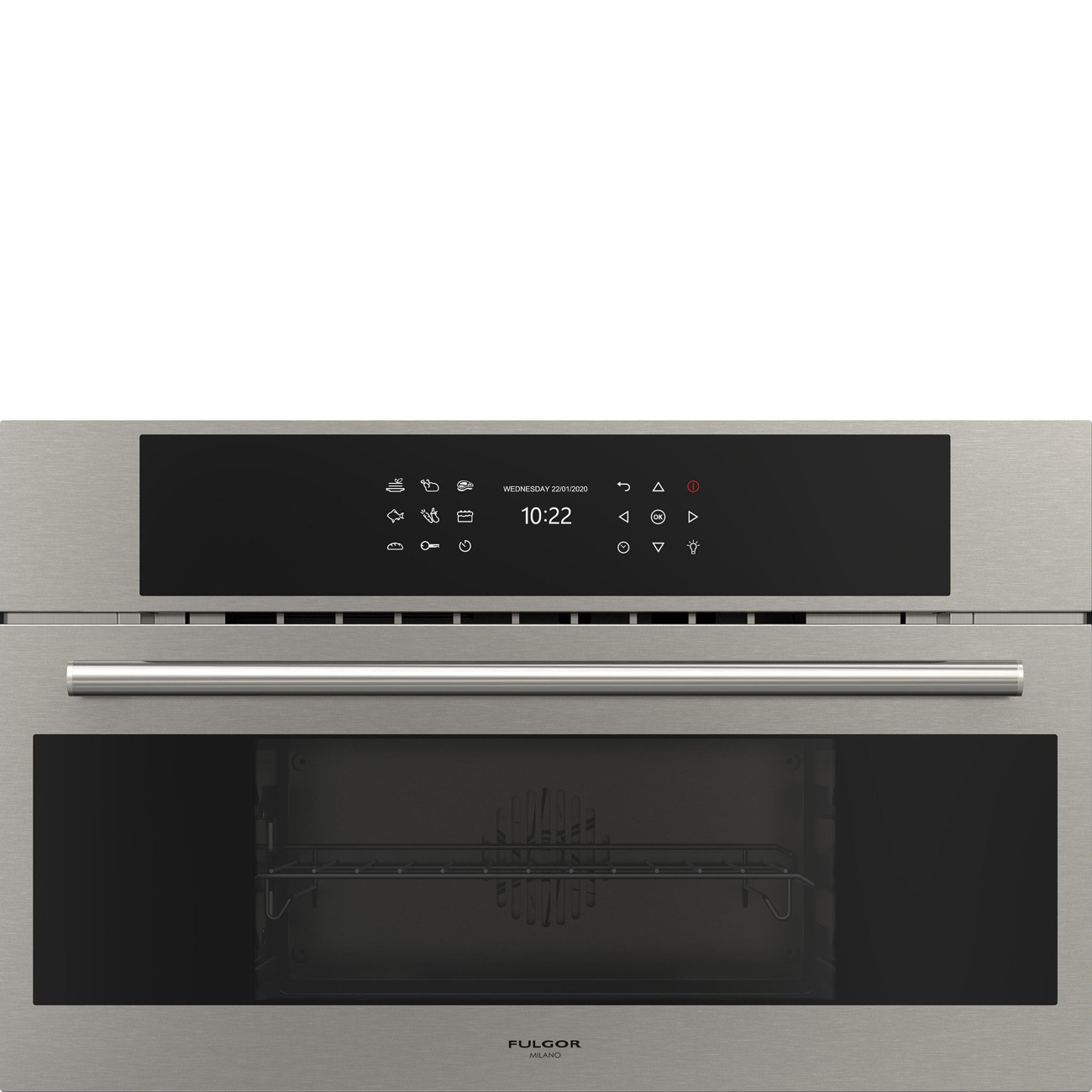 Piekarnik parowy Fulgor Milano FCSO 310 TEM X z serii Plano, w kolorze inox, o szerokości 76 cm i wysokości 48 cm, 34 l.