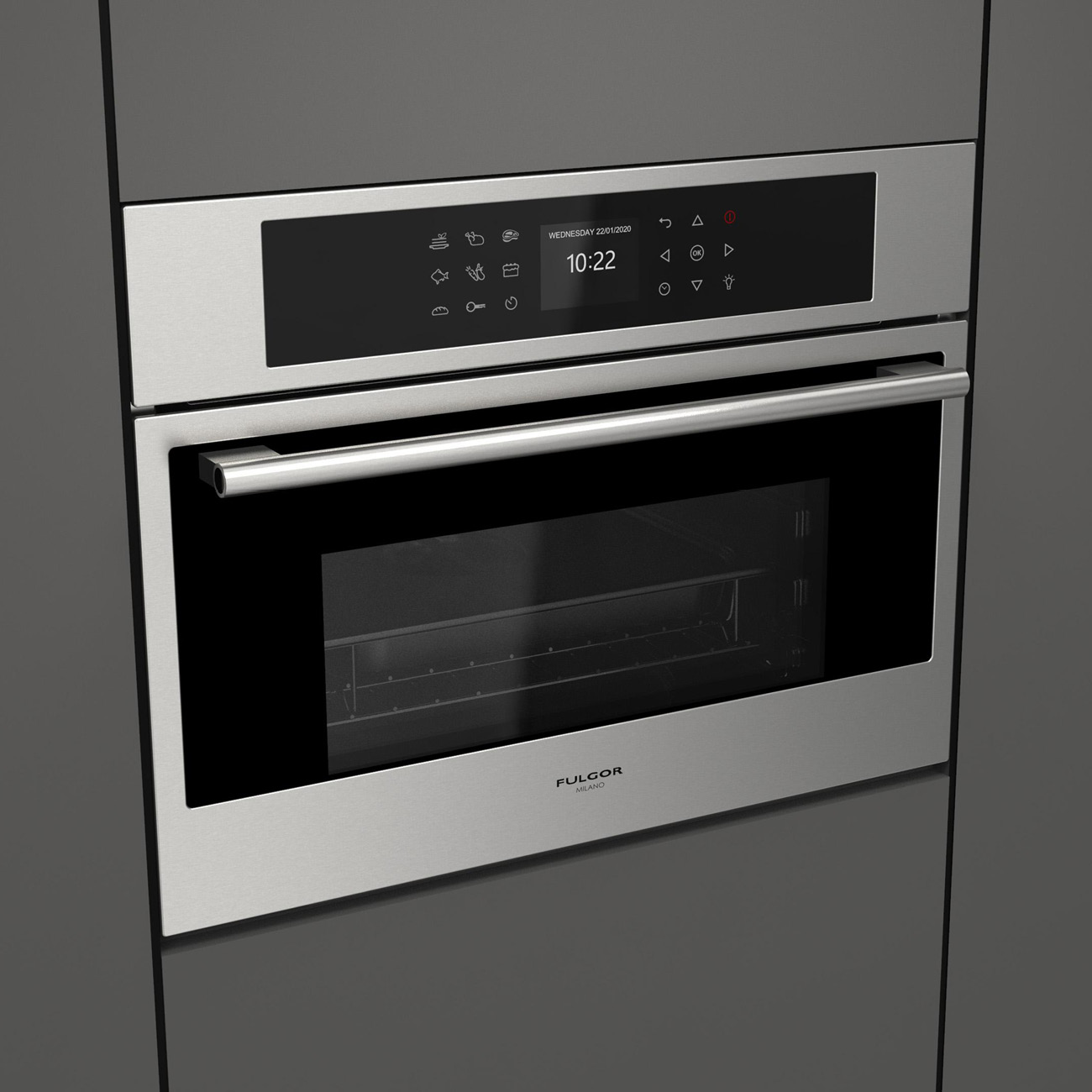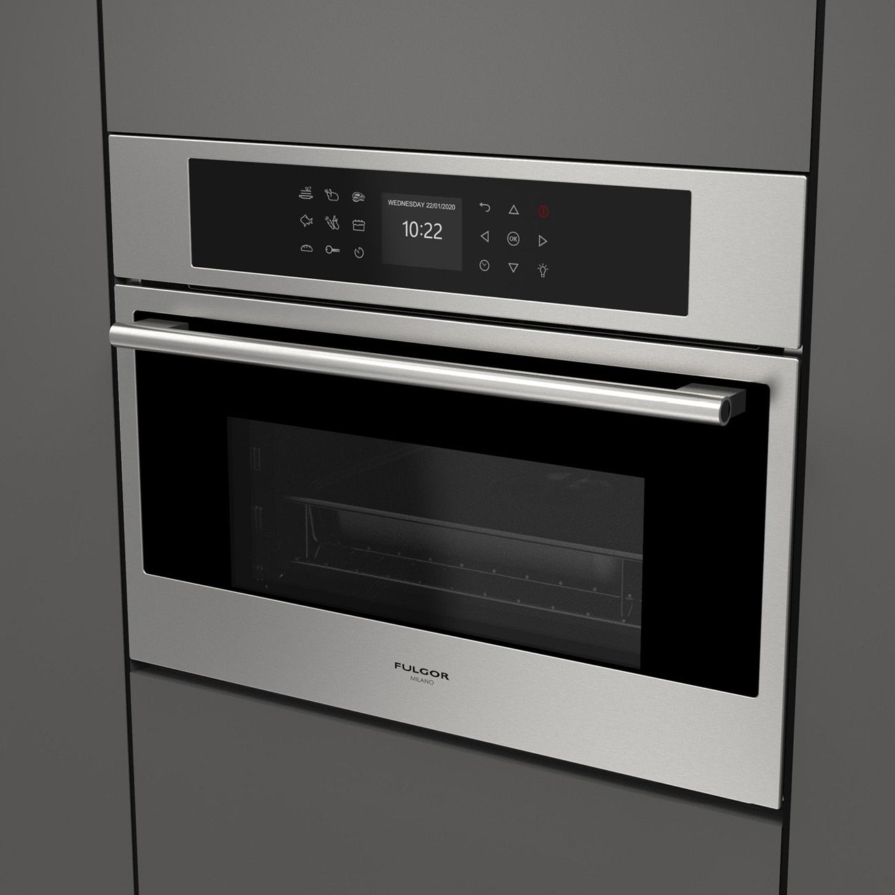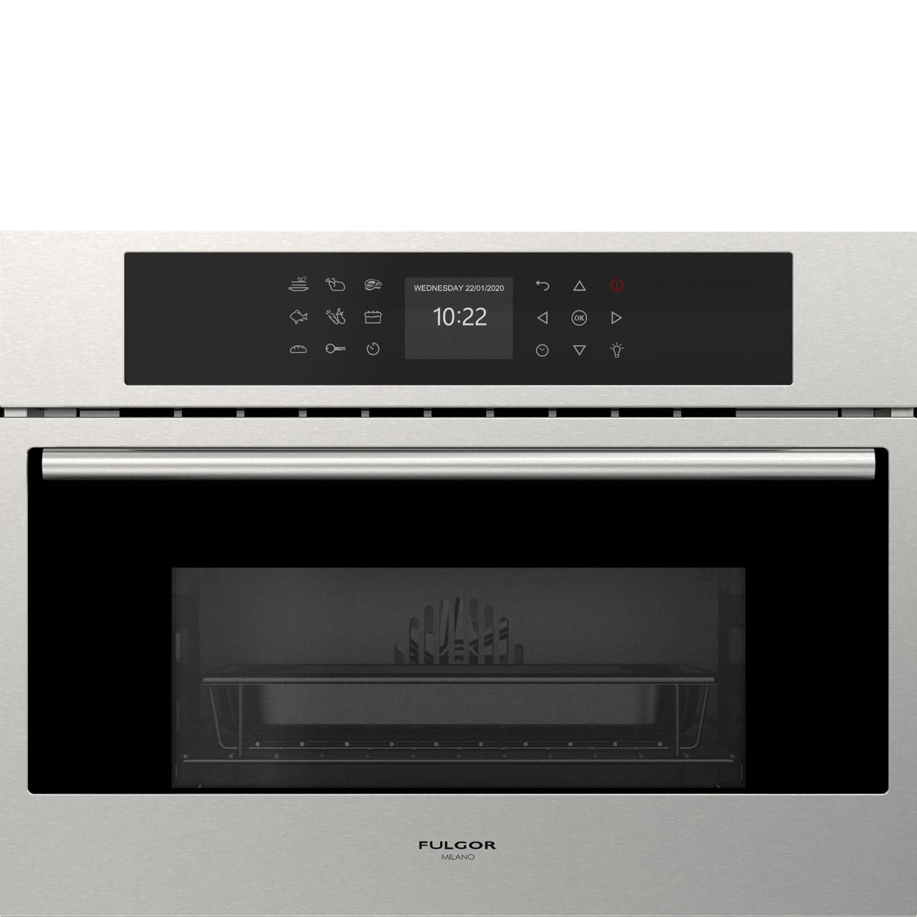 Piekarnik parowy Fulgor Milano FCSO 4510 TEM X z serii Plano, w kolorze inox, z funkcją gotowania na parze o szerokości 60 cm i wysokości 45 cm, A++, 34 l.