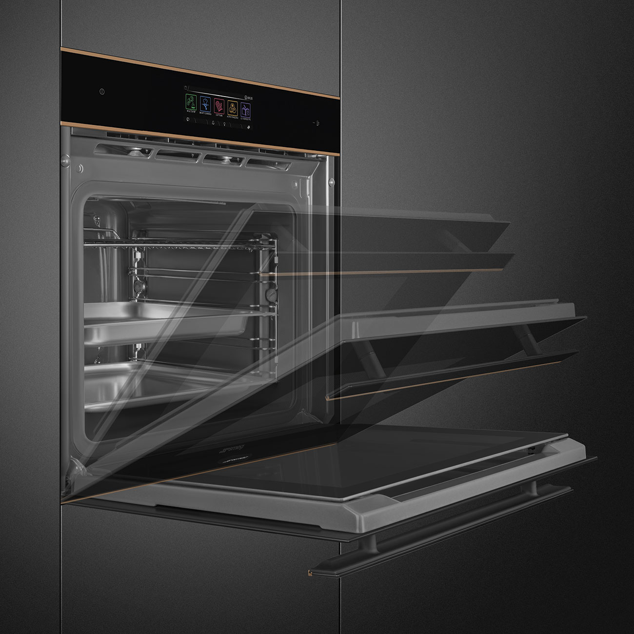 Piekarnik Smeg z funkcją pary do zintegrowanej zabudowy z serii Dolce Stil Novo z miedzianym wykończeniem komponentów i 5-letnią gwarancją producenta, czyszczenie parowe, wyświetlacz VivoScreen max, A++.