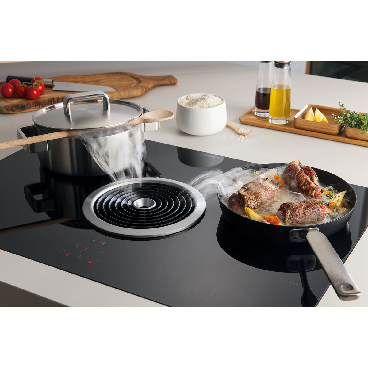 Płyta grzewcza Hyper BORA ze zintegrowanym wyciągiem oparów do zabudowy, wersja wyciąg, filtr tłuszczowy ze stali szlachetnej, powiększona powierzchnia grzewcza 4 x Ø24, 76 cm.