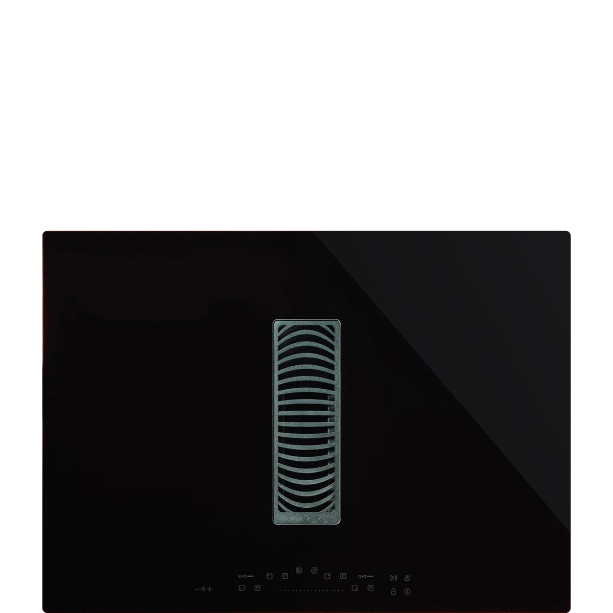 Płyta indukcyjna ze zintegrowanym okapem w kolorze czarnym, 4 pola grzewcze, 2 strefy łączone, tryb pracy okapu – pochłaniacz, 36~59 (69) dB, 145~345 (550) m³/h, A, 72 cm.