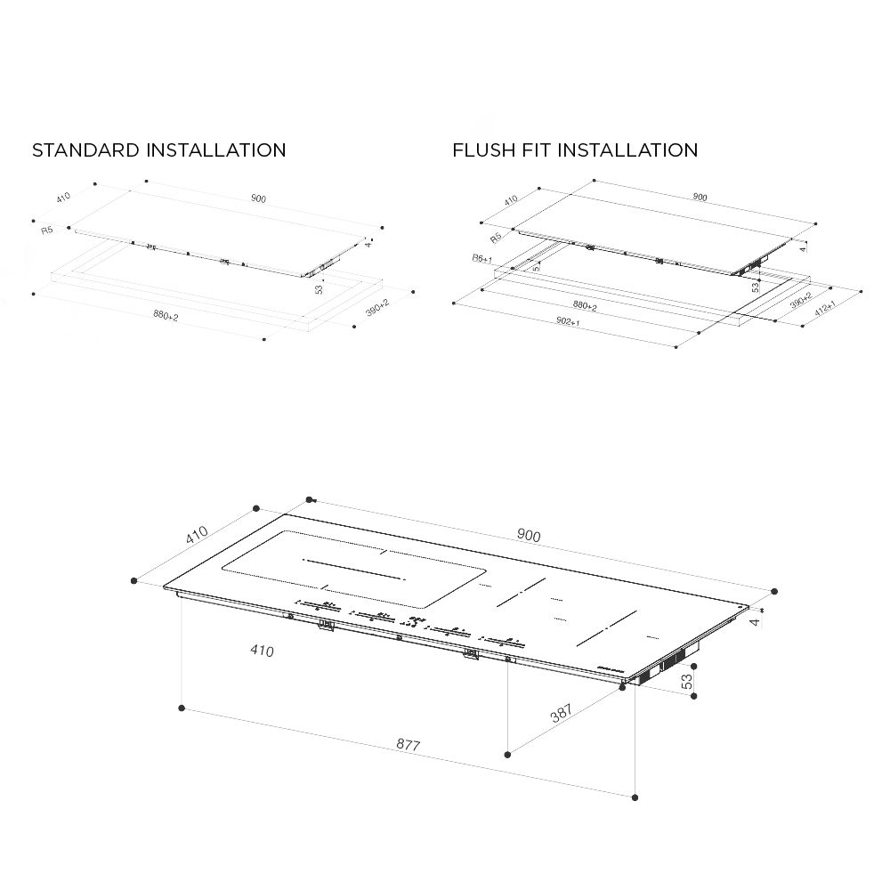 – 2 x 220×197 mm, o mocy 2100 W (Booster 3000 W), w funkcji Bridge: 220×395 mm, 3000 W (Booster 3700 W)
