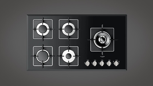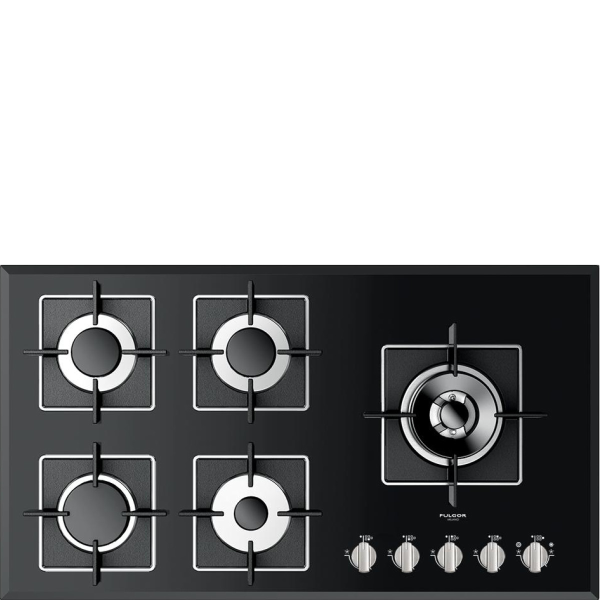Płyta gazowa do zabudowy na czarnym szkle hartowanym o grubości 8 mm, frezowane krawędzie, 5 palników z mosiężnymi podstawami, w tym jeden duży, podwójny typu WOK, nakładki rusztów żeliwnych w ramkach inox, kolor czarny, 90 cm.