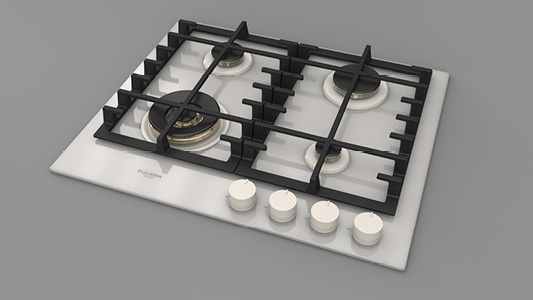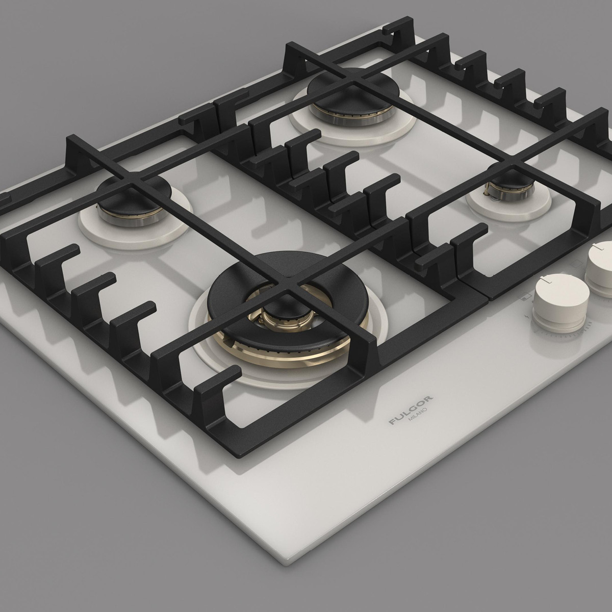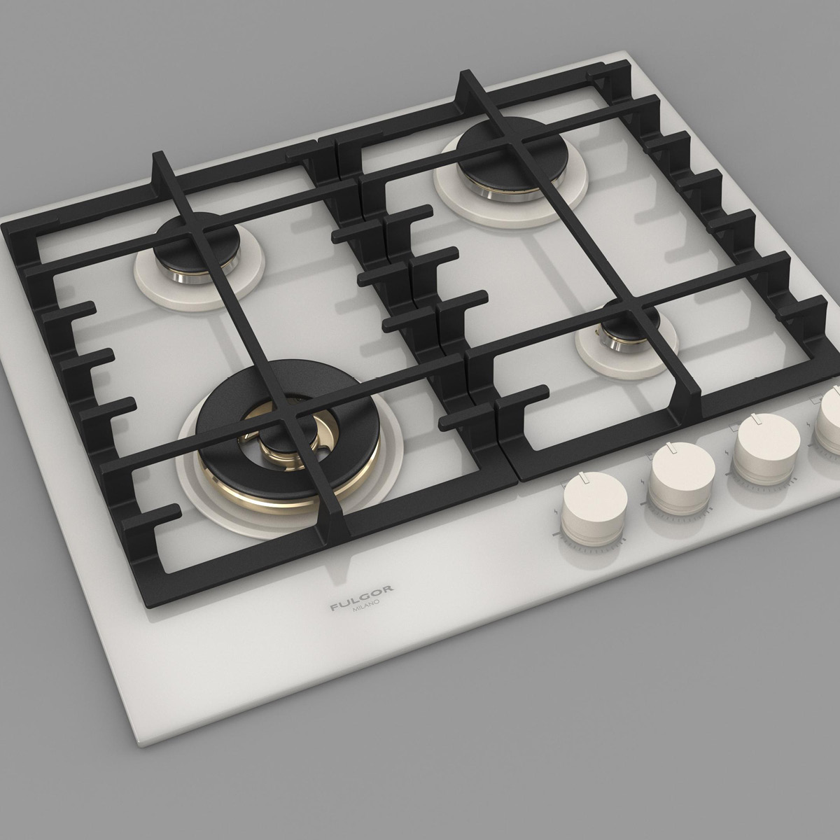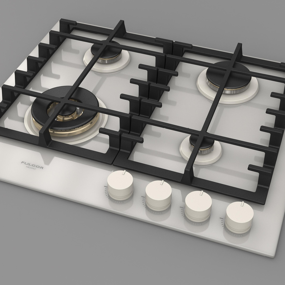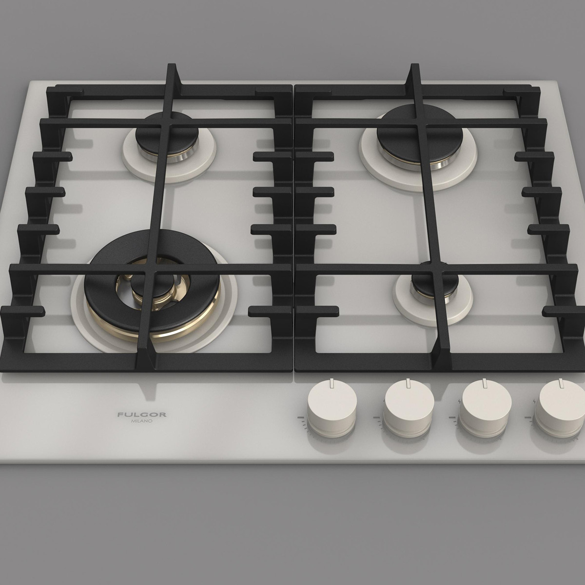 Płyta o szerokości 62 cm posiada unikalny, ekskluzywny design i wykończenie z białego szkła. Wyposażona jest w 4 mosiężne palniki, w tym jeden duży, podwójny typu WOK (4,0 kW) po lewej stronie i metalowe pokrętła w białym kolorze matowym. Żeliwne ruszty na całej powierzchni zapewniają maksymalne bezpieczeństwo i wygodę podczas przesuwania patelni lub garnków z jednego palnika na drugi. Płyta posiada także zawór przeciwwypływowy gazu, aby zapobiec ewentualnym wyciekom. W zestawie z płytą znajduje się żeliwna nakładka na WOK-a. Urządzenia Fulgor Milano produkowane są we Włoszech.