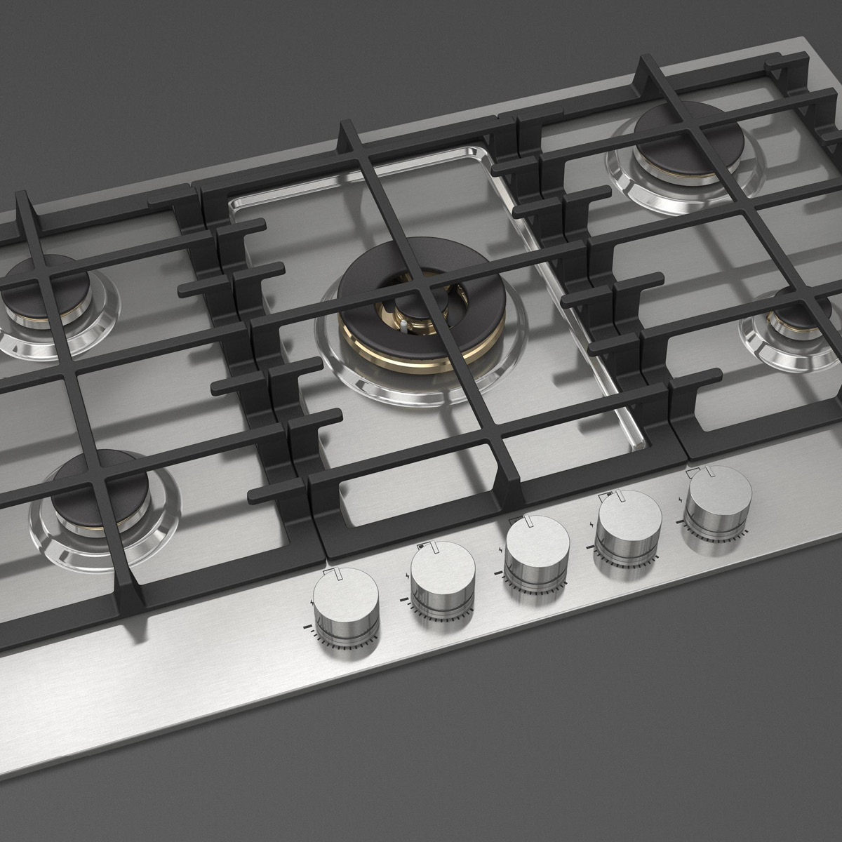 Płyta gazowa do zabudowy w kolorze inox, 5 mosiężnych palników, w tym jeden duży, podwójny typu WOK, żeliwne ruszty, 90 cm.