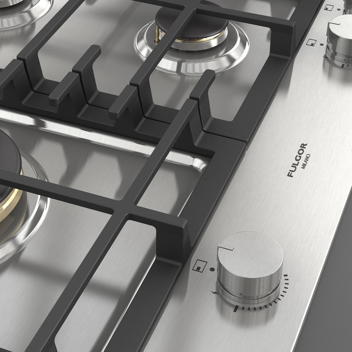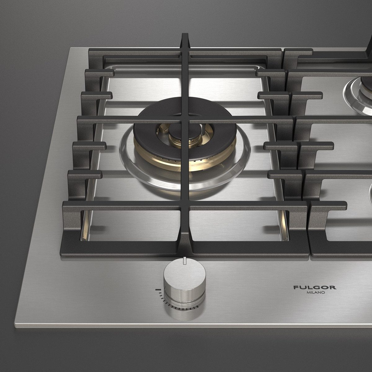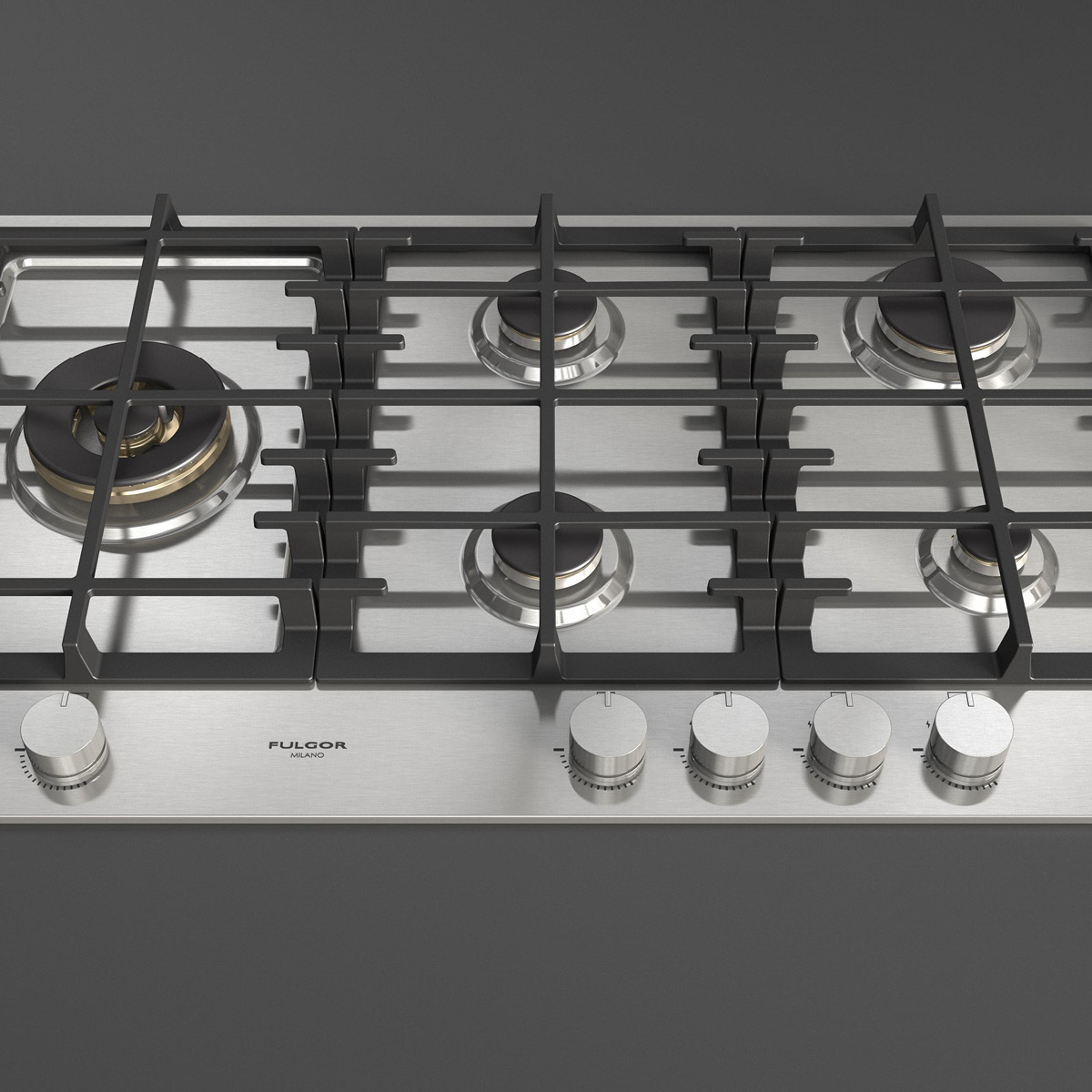 Płyta o szerokości 90 cm posiada unikalny, ekskluzywny design i wykończenie w satynowej stali nierdzewnej. Wyposażona jest w 5 mosiężnych palników, w tym jeden duży, podwójny typu WOK (4,0 kW) po lewej stronie i metalowe pokrętła inox. Żeliwne ruszty na całej powierzchni zapewniają maksymalne bezpieczeństwo i wygodę podczas przesuwania patelni lub garnków z jednego palnika na drugi. Płyta posiada także zawór przeciwwypływowy gazu, aby zapobiec ewentualnym wyciekom. W zestawie z płytą znajduje się żeliwna nakładka na WOK-a. Urządzenia Fulgor Milano produkowane są we Włoszech.