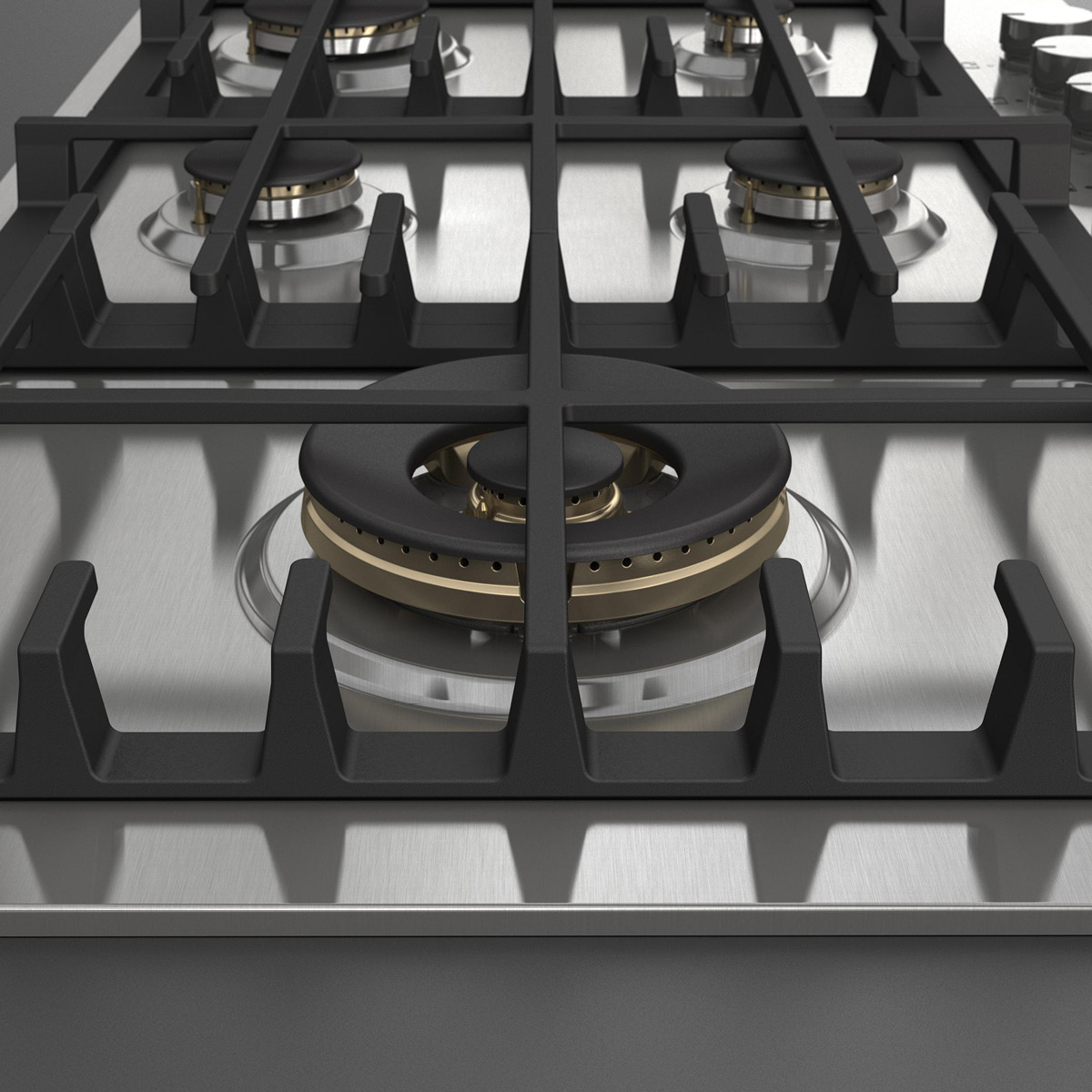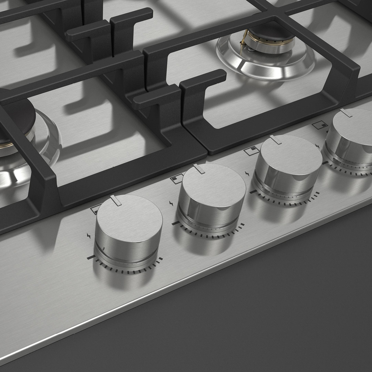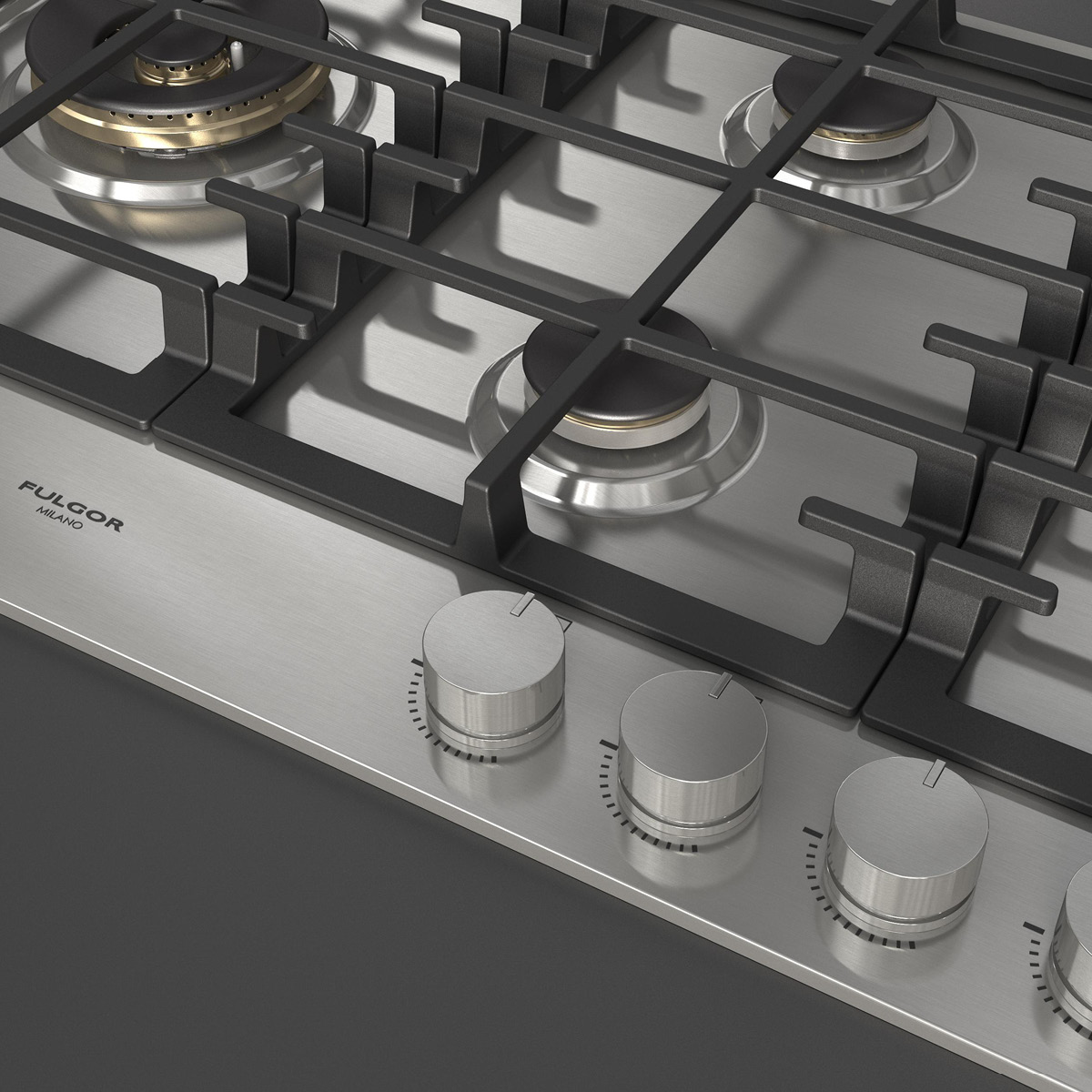 Płyta o szerokości 90 cm posiada unikalny, ekskluzywny design i wykończenie w satynowej stali nierdzewnej. Wyposażona jest w 5 mosiężnych palników, w tym jeden duży, podwójny typu WOK (4,0 kW) po lewej stronie i metalowe pokrętła inox. Żeliwne ruszty na całej powierzchni zapewniają maksymalne bezpieczeństwo i wygodę podczas przesuwania patelni lub garnków z jednego palnika na drugi. Płyta posiada także zawór przeciwwypływowy gazu, aby zapobiec ewentualnym wyciekom. W zestawie z płytą znajduje się żeliwna nakładka na WOK-a. Urządzenia Fulgor Milano produkowane są we Włoszech.