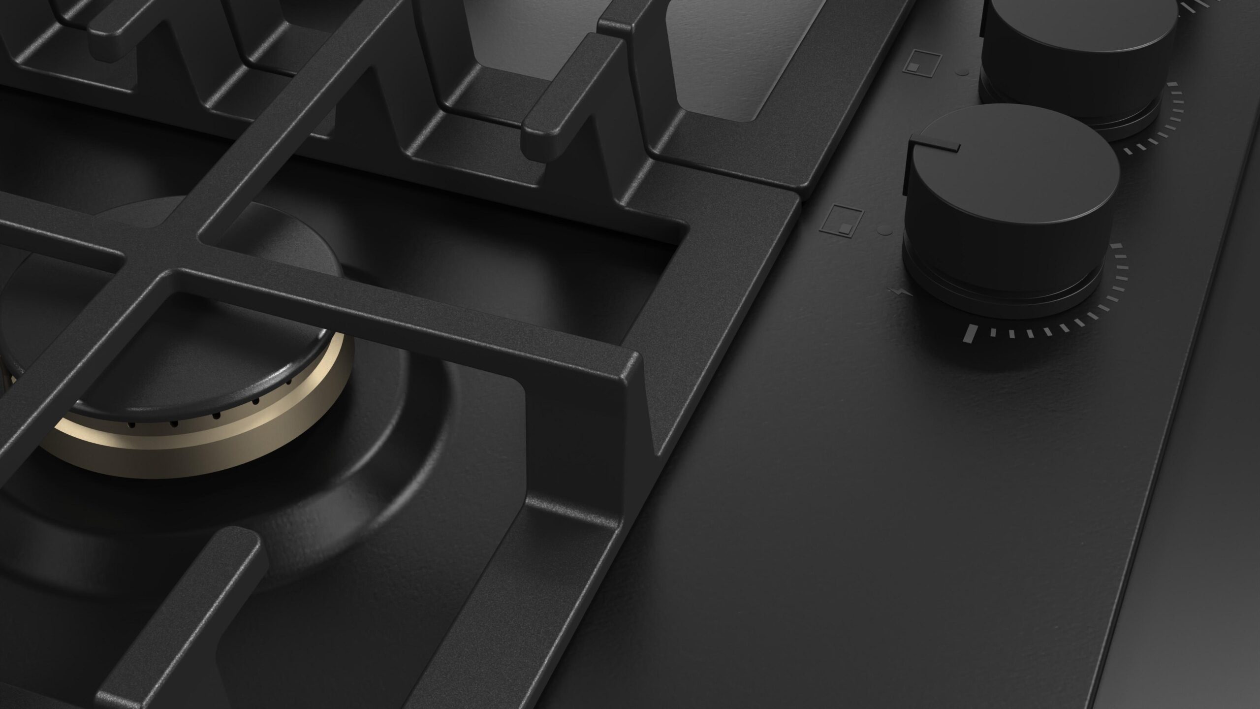 Idealnie dopasowane do projektu płyty URBANTECH, czarne, matowe pokrętła są łatwe w użyciu i zapewniają precyzyjną kontrolę nad procesem gotowania.