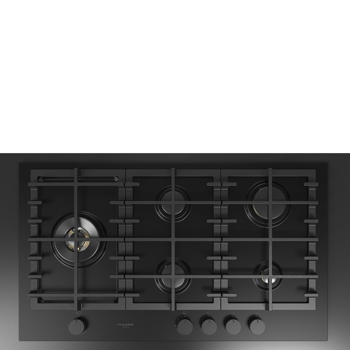 Płyta gazowa do zabudowy z serii URBANTECH w kolorze czarny mat, 5 mosiężnych palników, w tym jeden duży, podwójny typu WOK, żeliwne ruszty, kolor czarny, 90 cm.