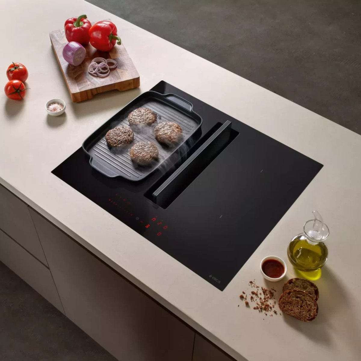 Płyta indukcyjna ze zintegrowanym okapem firmy Elica do zabudowy, wersja wyciąg, czarne szkło, 72 cm.