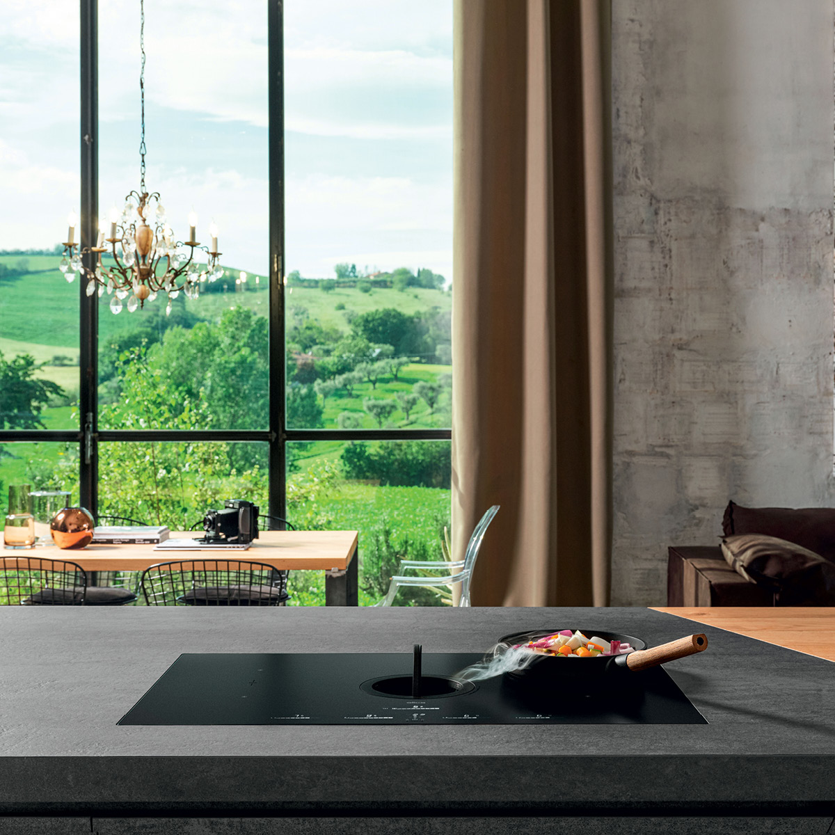 Płyta indukcyjna ze zintegrowanym okapem firmy Elica do zabudowy, wersja wyciąg, czarne matowe szkło, 83 cm.