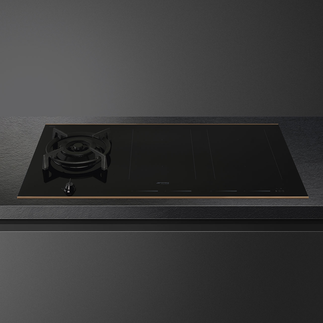 Płyta indukcyjno-gazowa Smeg do zabudowy nablatowej z serii Dolce Stil Novo w kolorze czarnym, 1 palnik, 4 strefy indukcyjne, 2 strefy Multizone, z 5-letnią gwarancją producenta, 90 cm.