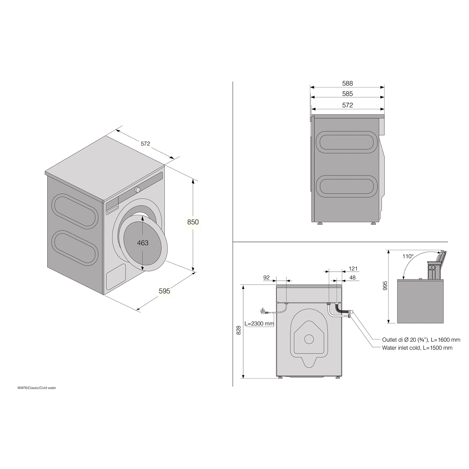 - Podłączenie wody: Rozmiar 3/4″” – podłączenie do zimnej wody