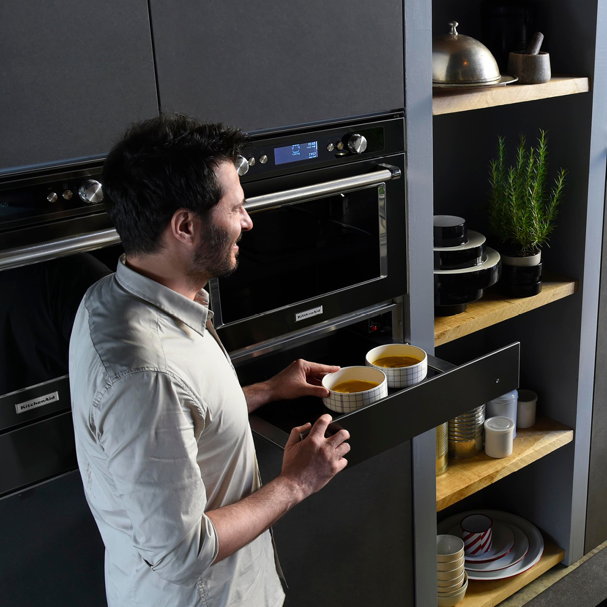 Szuflada grzewcza firmy KitchenAid do zintegrowanej zabudowy z serii Black Steel, w kolorze czarna stal szlachetna, 14 cm.