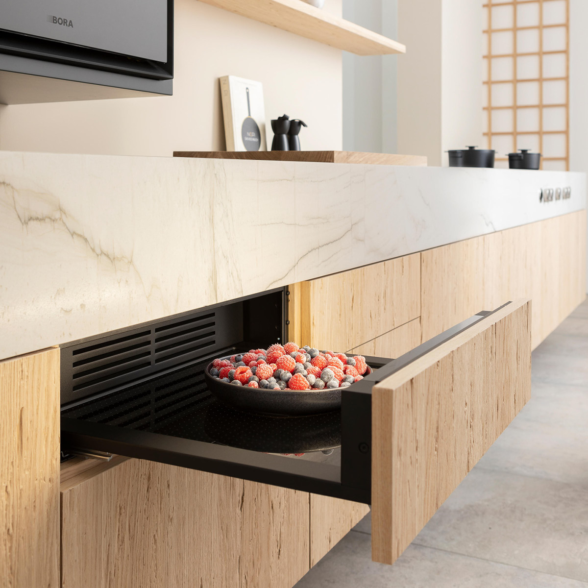 Minimalistyczny design szuflady wielofunkcyjnej BORA rezygnuje ze wszystkiego, co zbędne, i zachwyca zlicowaną powierzchnią bez uchwytów. Dzięki temu dyskretnie integruje się w każdej współczesnej kuchni.