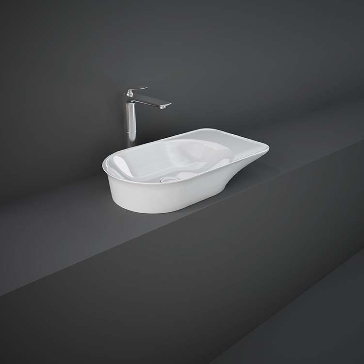 Umywalka nablatowa firmy RAK Ceramics z kolekcji VALET z możliwością montażu lewo- i prawostronnego, w kolorze biały połysk, bez otworu na baterię.