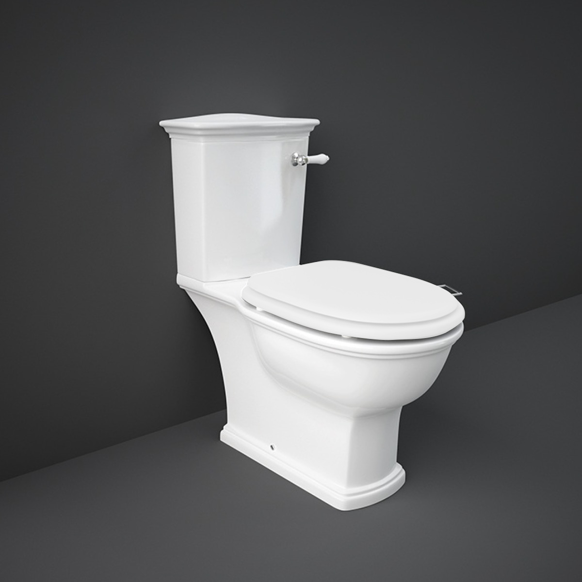 Kompakt WC stojący firmy RAK Ceramics z kolekcji WASHINGTON: miska WC, zbiornik z dźwignią z przodu, deska wolnoopadająca w kolorze biały mat.