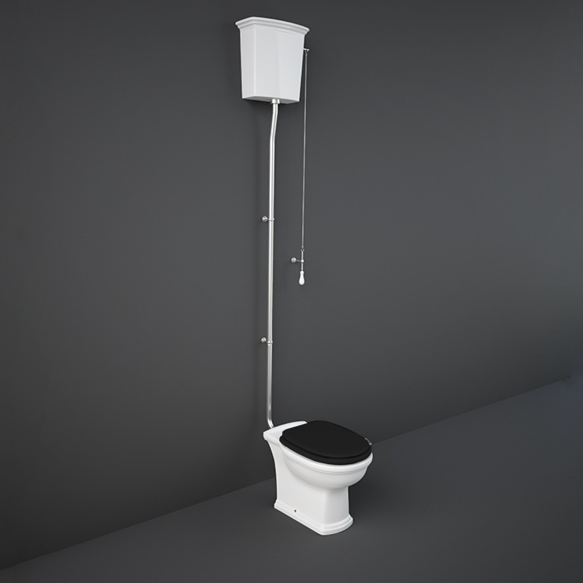 Kompakt WC stojący firmy RAK Ceramics z kolekcji WASHINGTON: miska WC, zbiornik wiszący, deska wolnoopadająca w kolorze czarny mat.