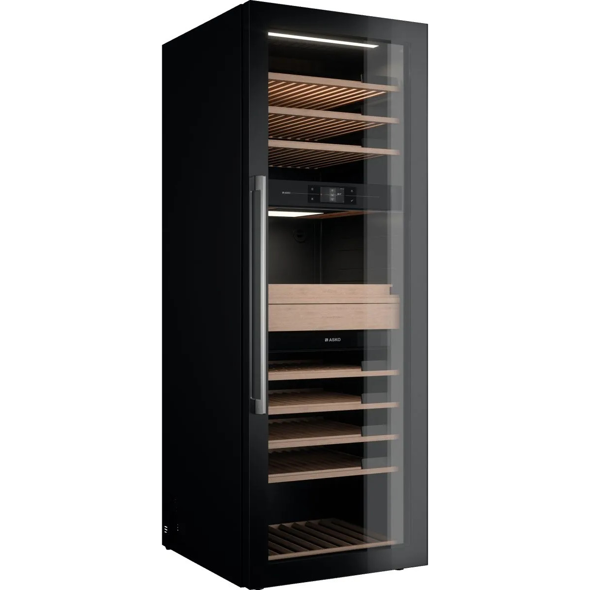 Szafa klimatyzowana na wino ASKO pomieści do 190 butelek, przechowując je na pojemnych, teleskopowych półkach, do których jest łatwy dostęp. Małe, wmontowane tablice kredowe pozwalają na oznaczenie kolekcji na półkach.