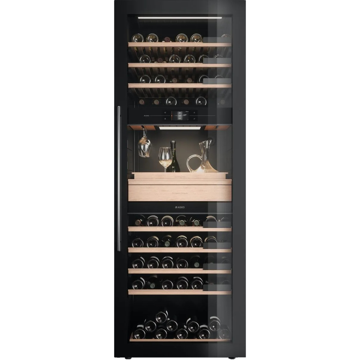 Po włożeniu tak wiele wysiłku w przechowywanie wina i doprowadzenie go do odpowiedniej temperatury, zasługuje ono na perfekcyjne podanie. Szafka klimatyczna na wino ASKO posiada część do serwowania z miejscem na kieliszki i akcesoria oraz kontrolowaną lampkę do sprawdzania wina. Jeśli chcesz zmieścić więcej butelek w szafce, część do serwowania można przekształcić w półki.