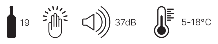 Chłodziarka na wino do zabudowy, 19 butelek, push2open, 37 dB, 1-strefowa (5~18 °C), zintegrowana wentylacja, wi-fi.