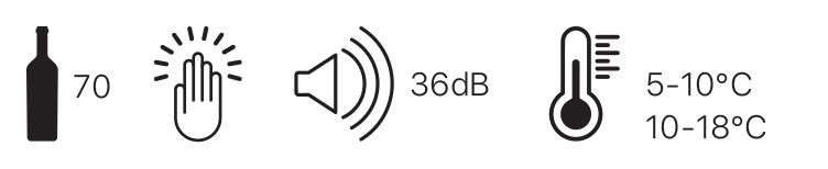 Chłodziarka na wino do zabudowy, 70 butelek, push2open, 36 dB, 2-strefowa (5~18 °C i 10~18°C), zintegrowana wentylacja, wi-fi.