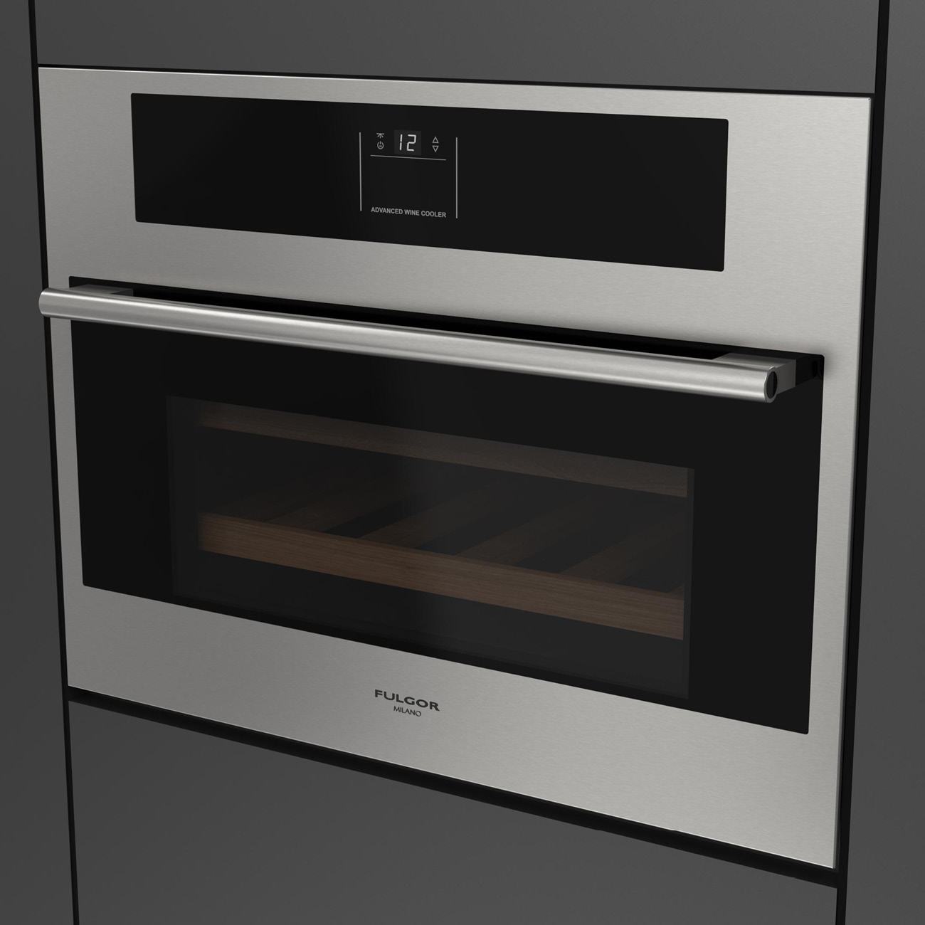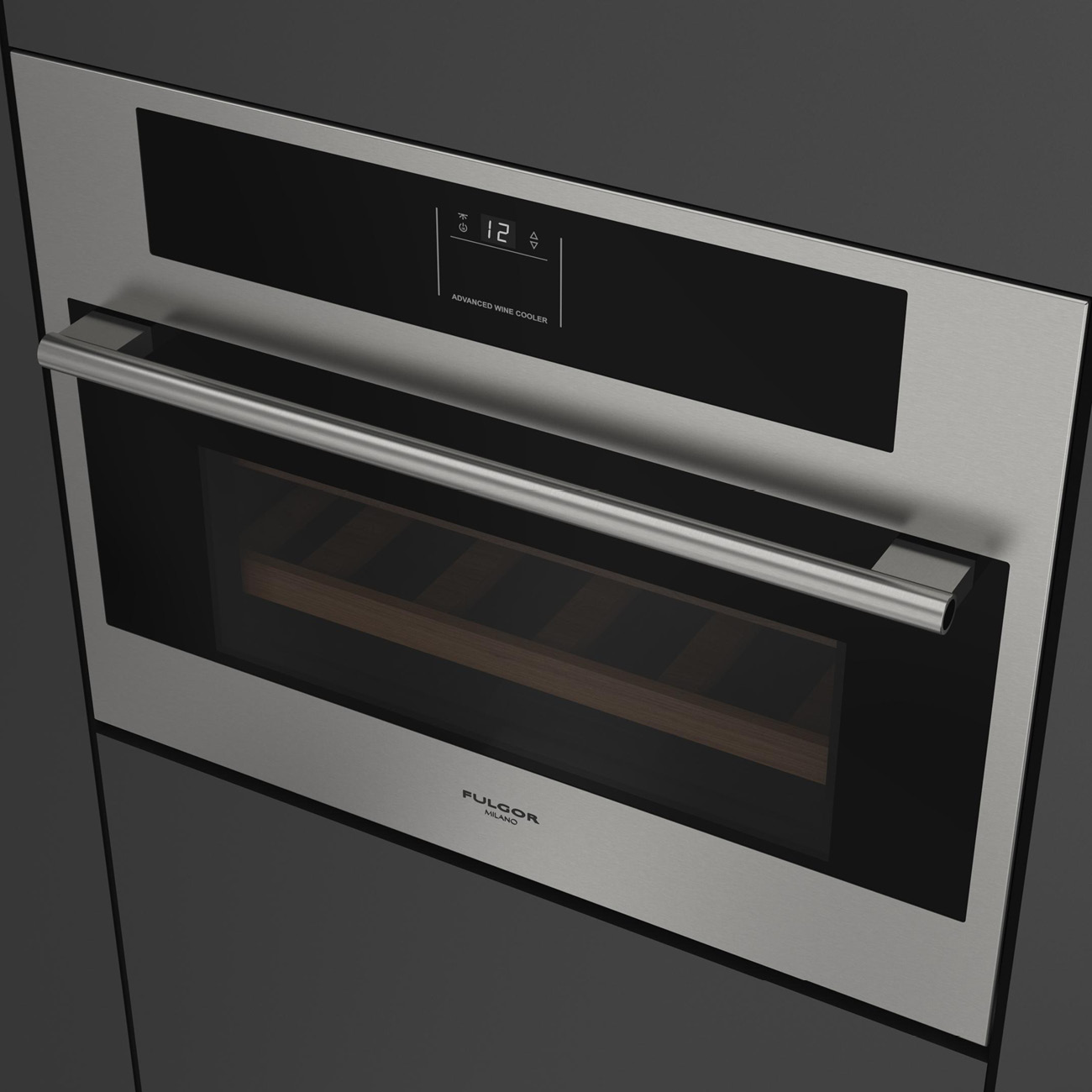 Chłodziarka na wino do zabudowy Fulgor Milano FWC 4500 TC FO X z serii Plano, w kolorze inox, ochrona UV, systemy antywibracyjny i antykondensacyjny, elektroniczna regulacja temperatury, 22 butelki.