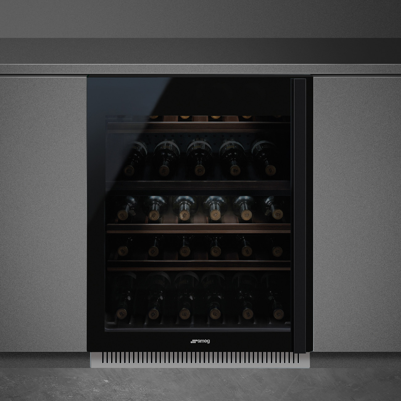 Chłodziarka na wino Smeg do zabudowy z serii Dolce Stil Novo w kolorze czarnym, dotykowe sterowanie elektroniczne, lewy zawias, z 5-letnią gwarancją producenta, 38 butelek.